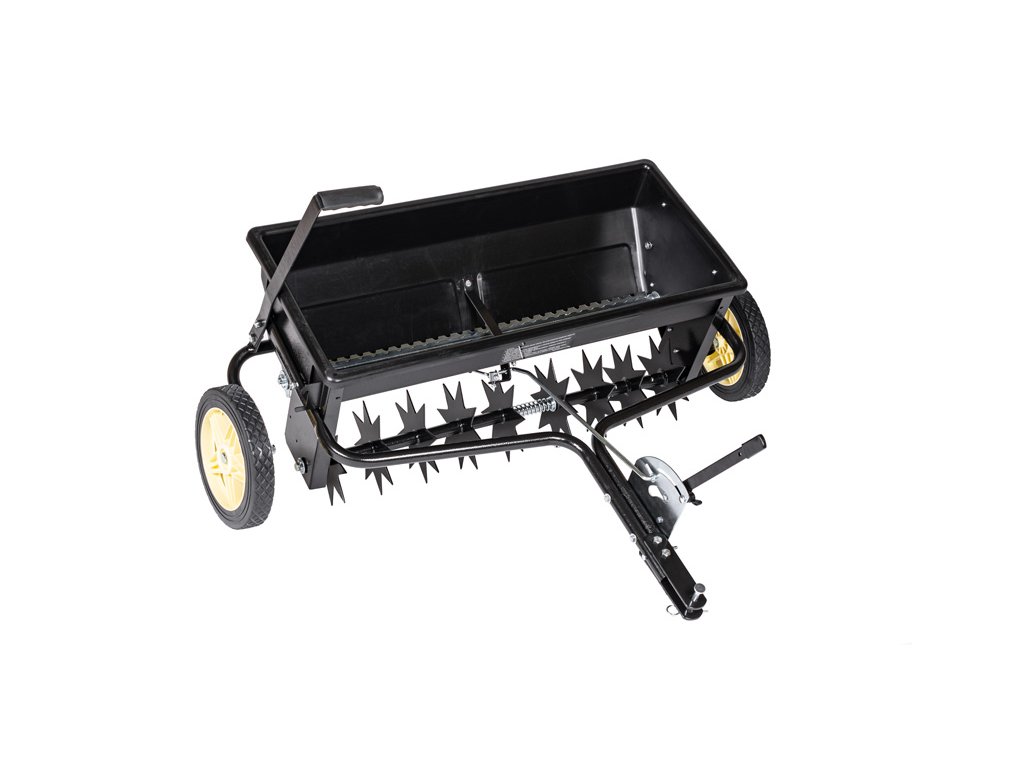 - Stroj je určen k tažení za zahradním traktorem a připojuje se pomocí čepového závěsu. Konstrukce je ocelová, vybavena 2 koly pro snadný převoz a nastavitelným ovládáním průtoku látky i výšky nožů. Hvězdicové nože dosahují ideální hloubky pro podporu růstu travního porostu bez zbytečného poškození.