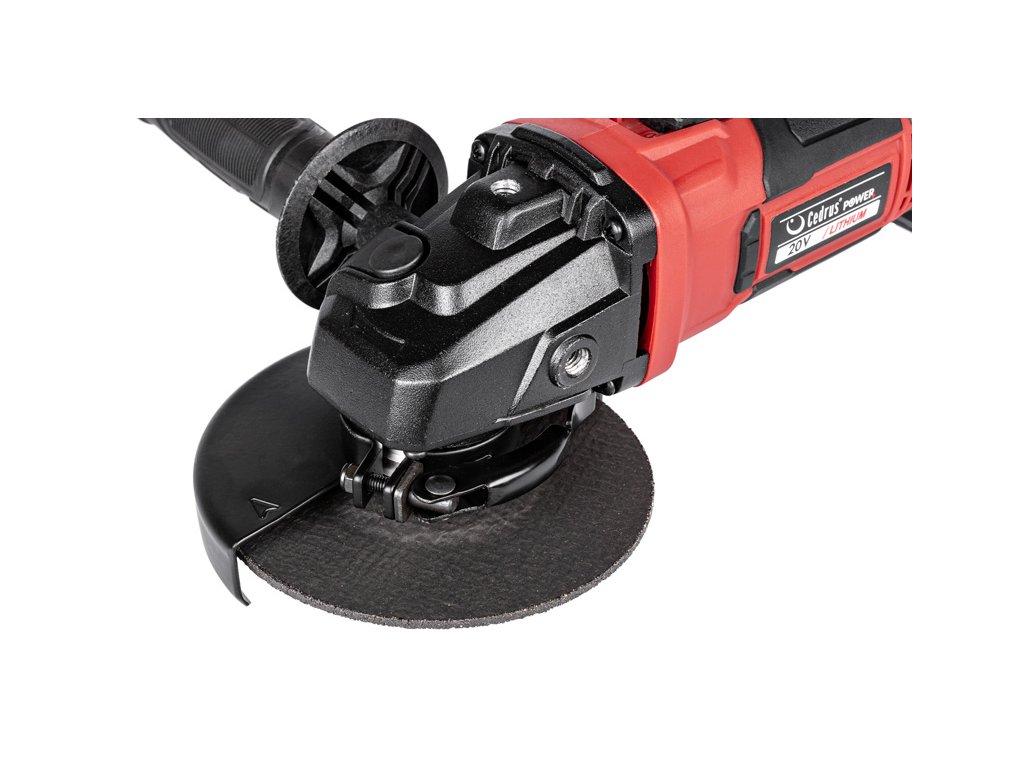 - Bruska je vybavena ochranným krytem s rychloupínacím mechanismem, který umožňuje rychlé přenastavení bez použití nářadí. Pomocný boční úchyt lze připevnit ve třech různých polohách, což zvyšuje komfort a přesnost práce. Přístroj je osazen 125mm kotoučem a disponuje závitem M14, kompatibilním se standardními kotouči.