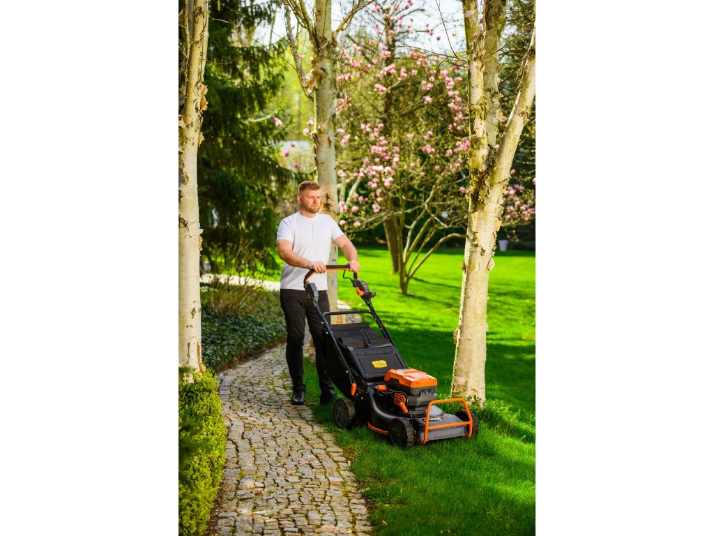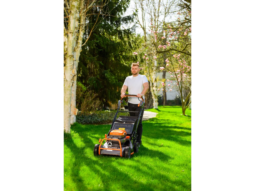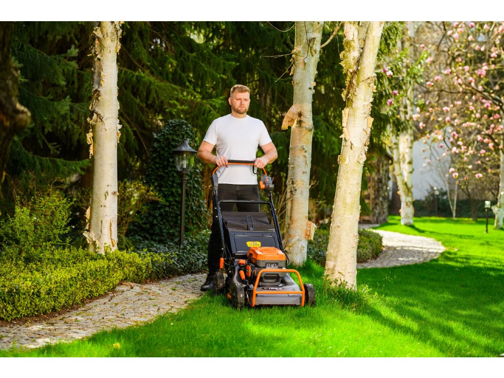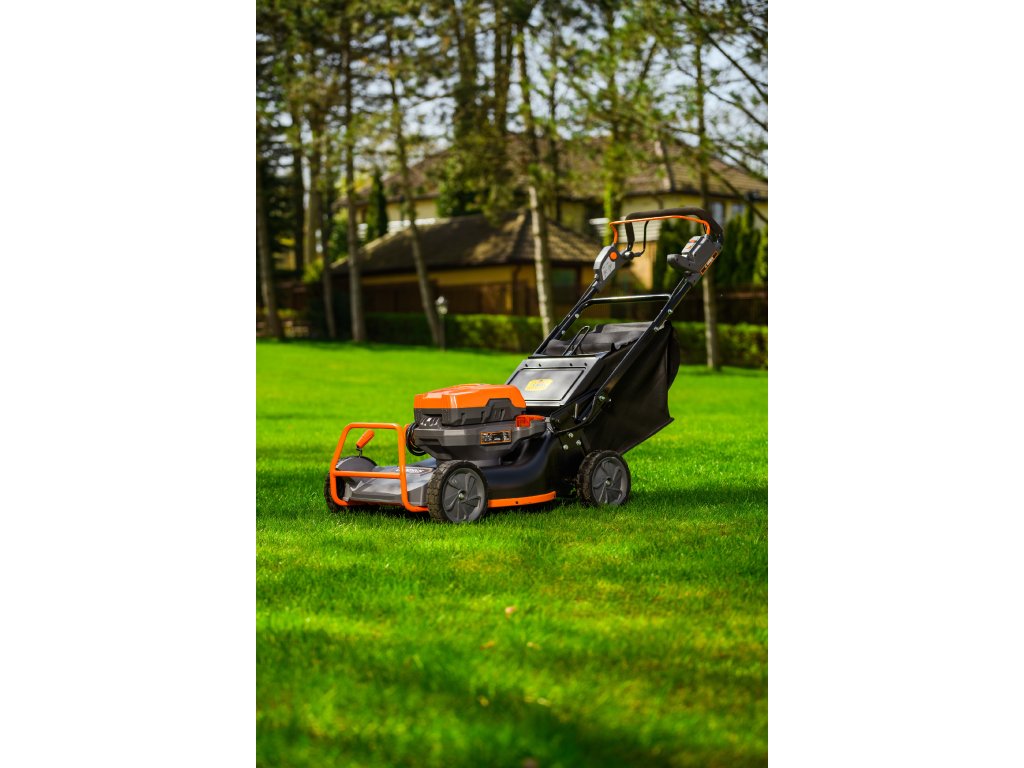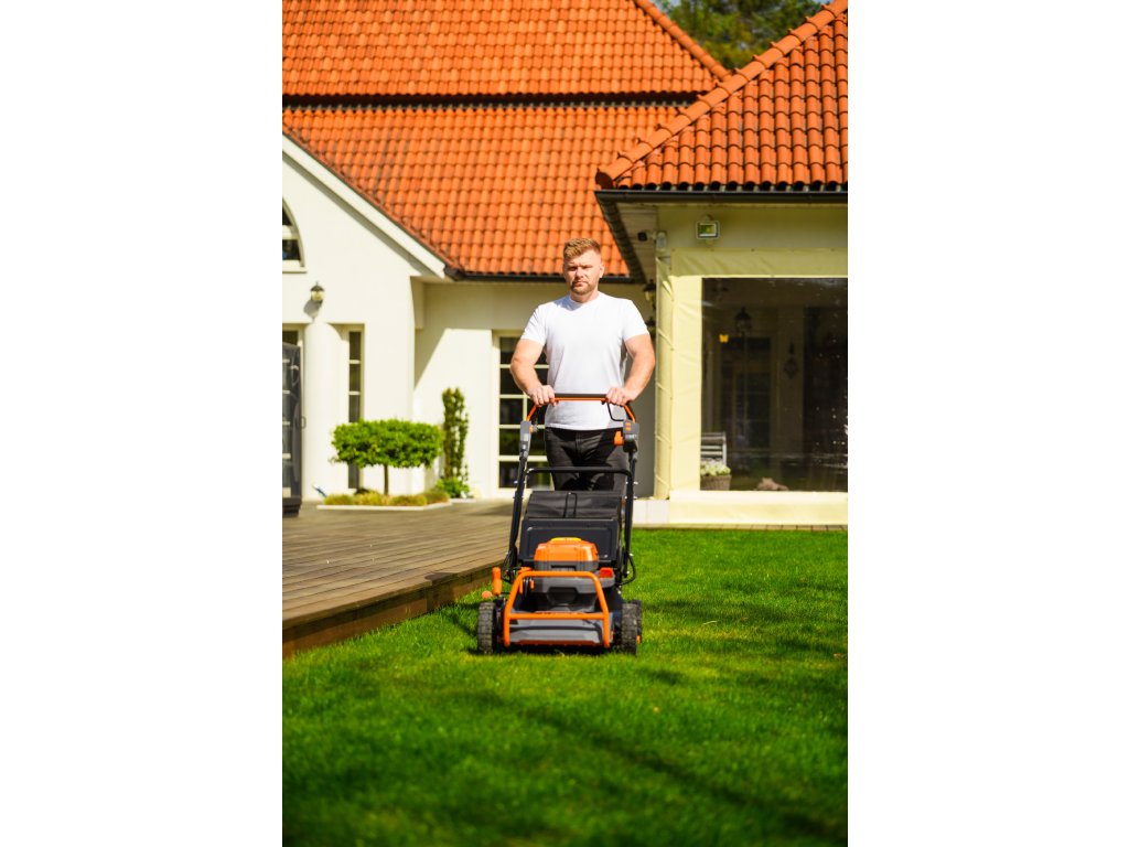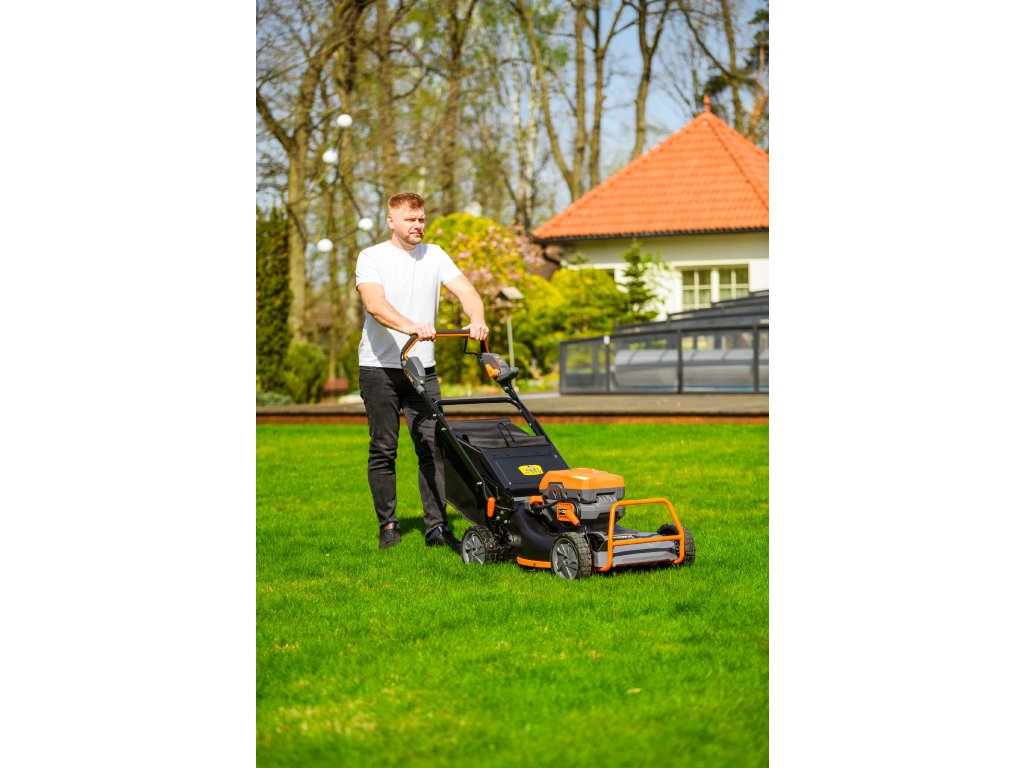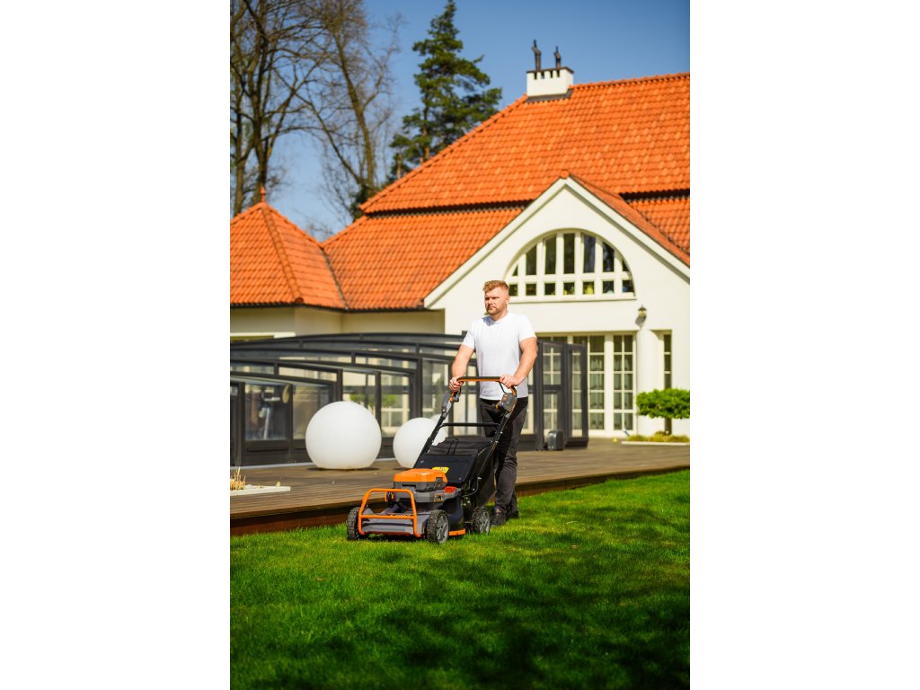 - Přes svou robustní konstrukci váží pouze 47,5 kg, což spolu s integrovaným pojezdem zajišťuje pohodlnou manipulaci i při delším sečení.