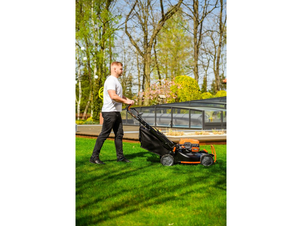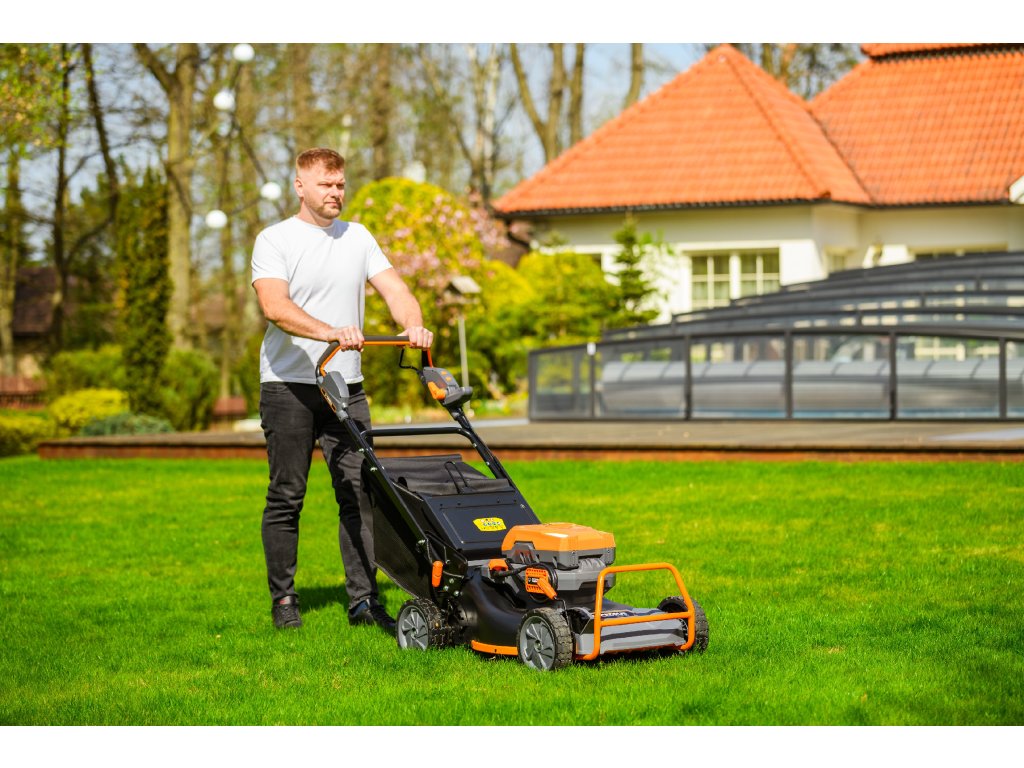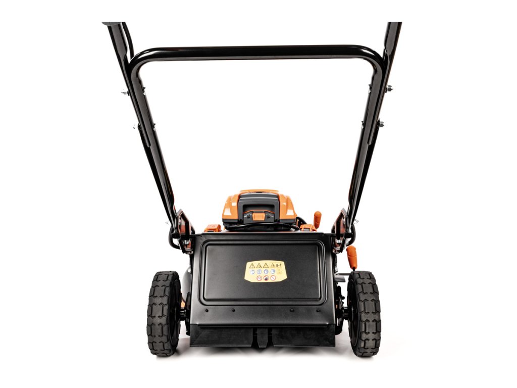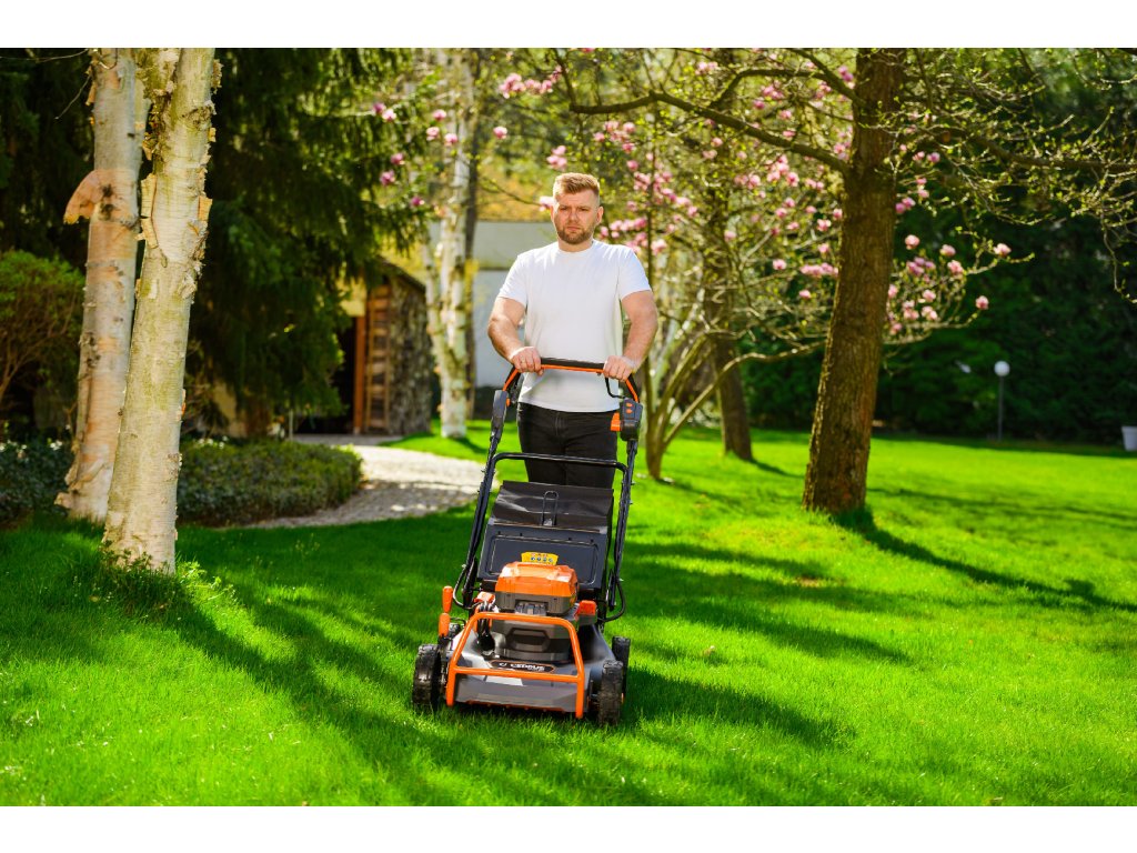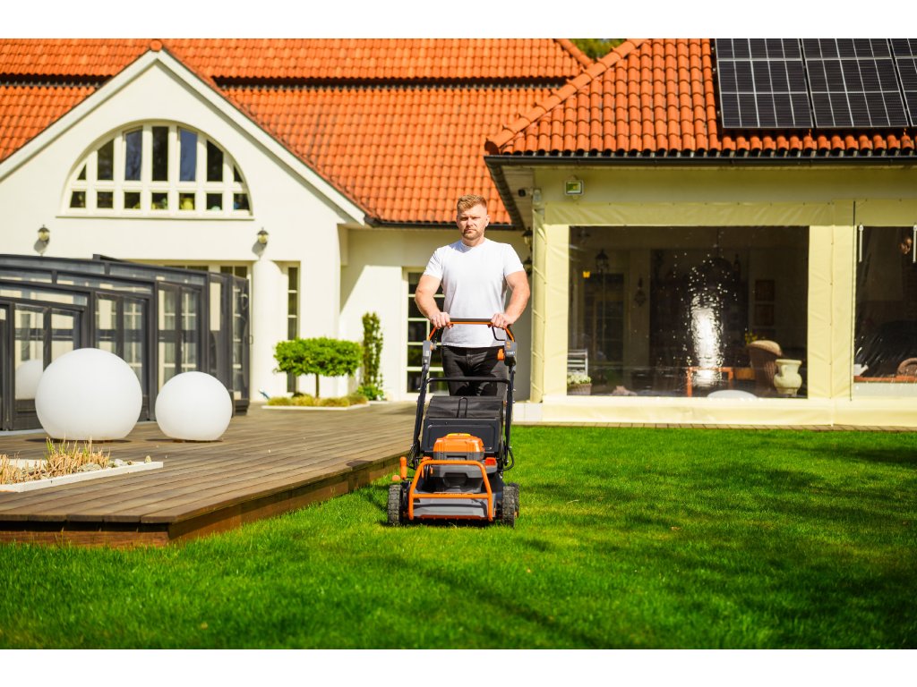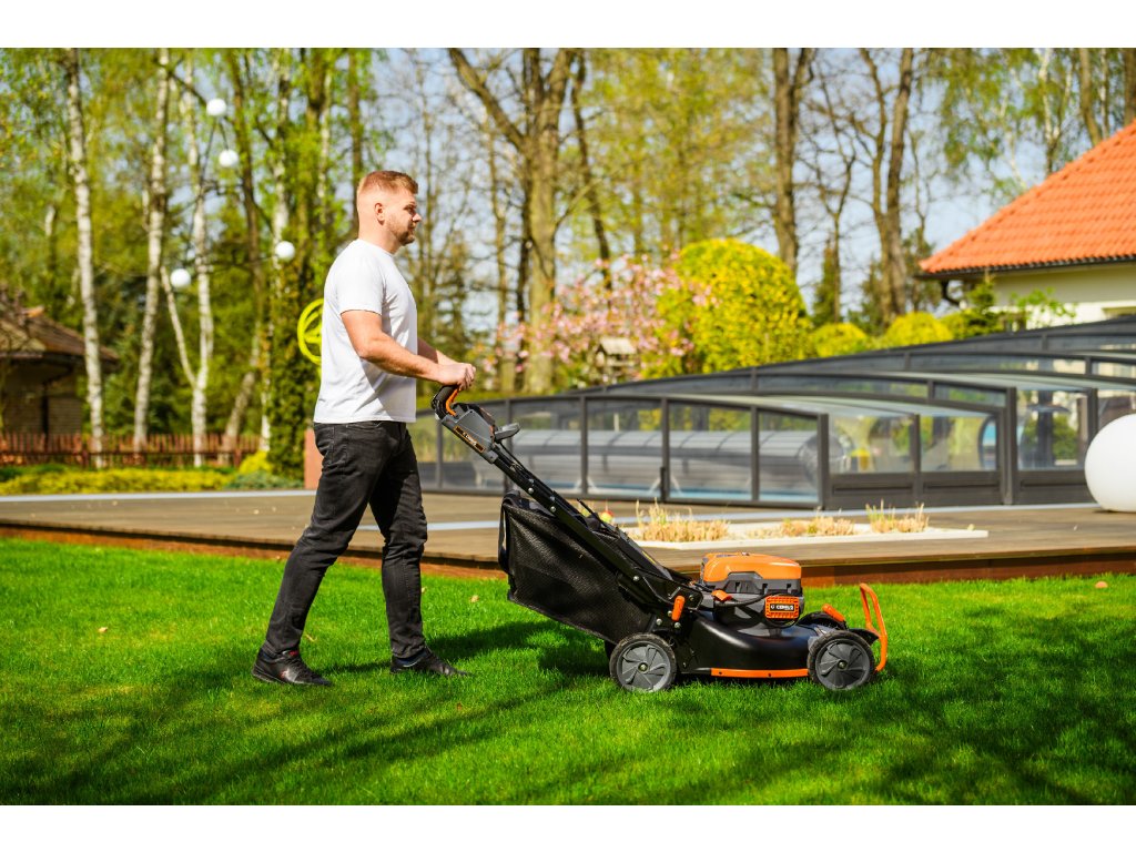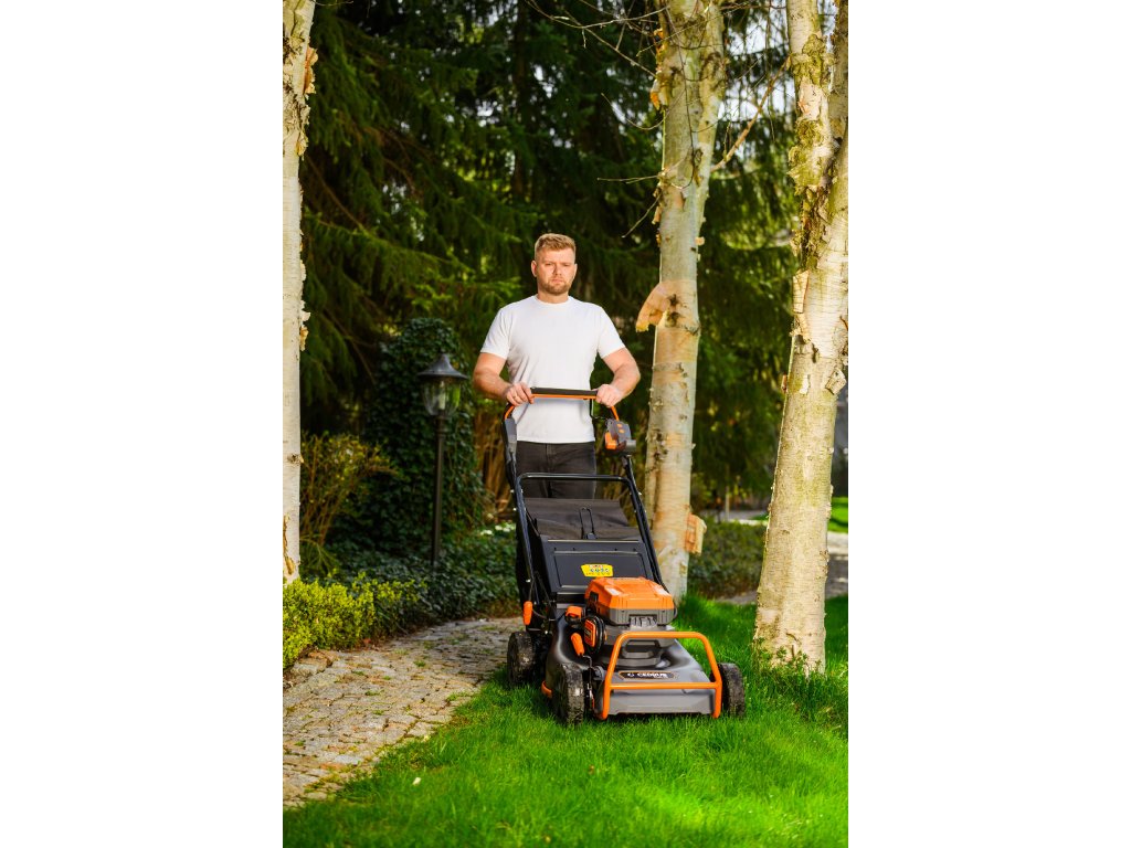 - Přes svou robustní konstrukci váží pouze 47,5 kg, což spolu s integrovaným pojezdem zajišťuje pohodlnou manipulaci i při delším sečení.