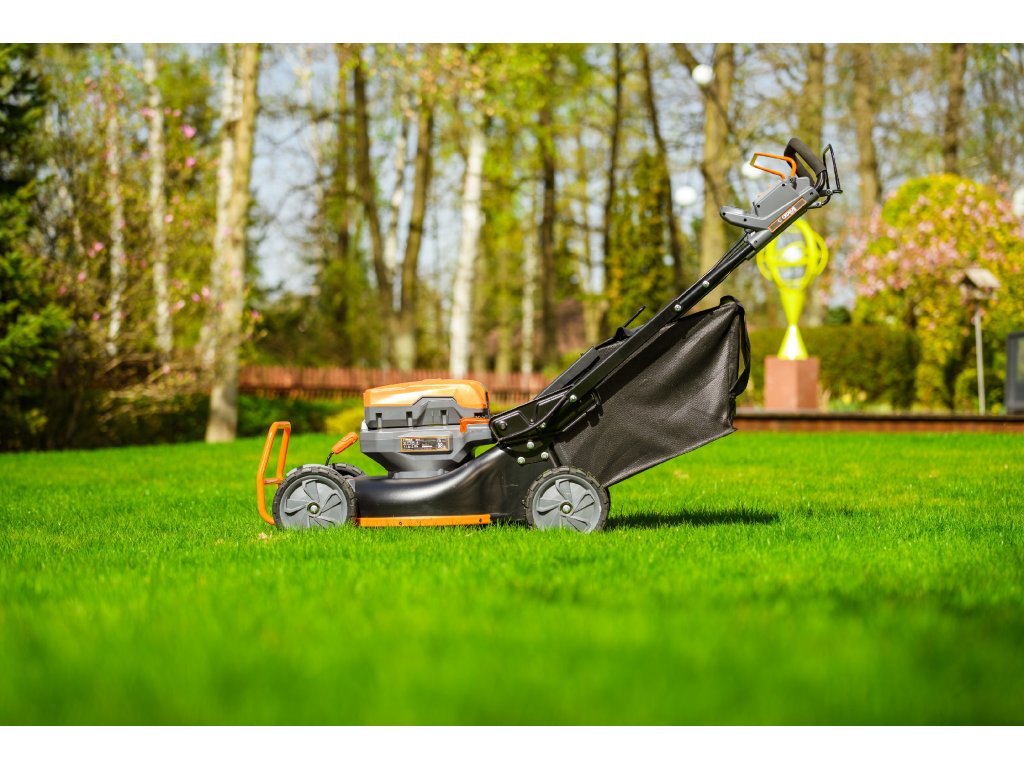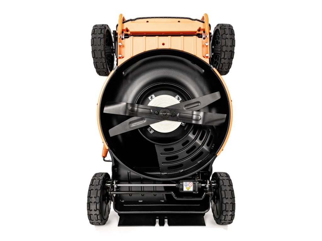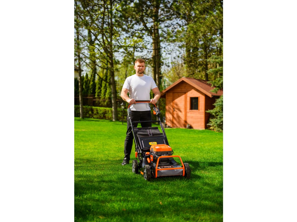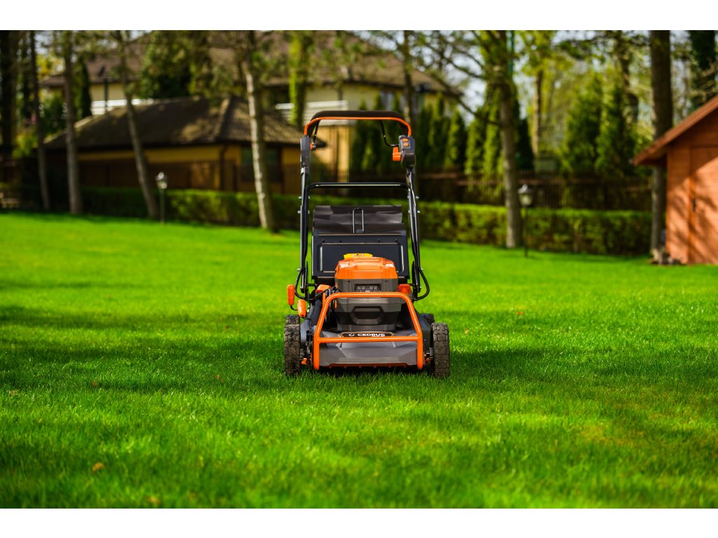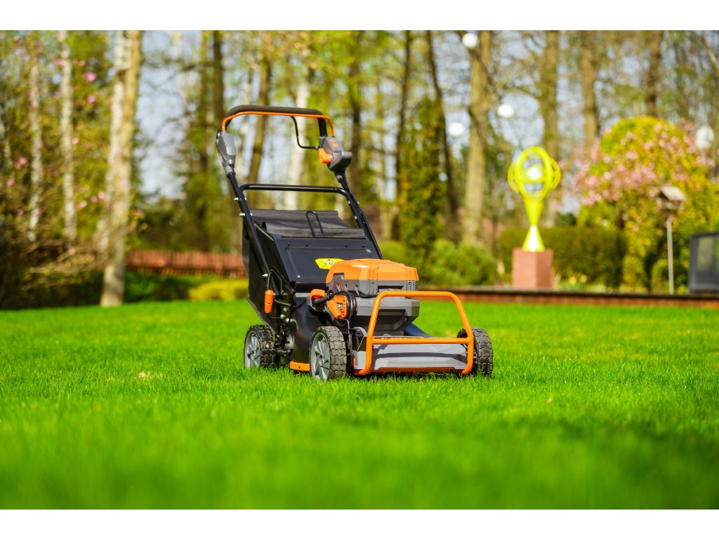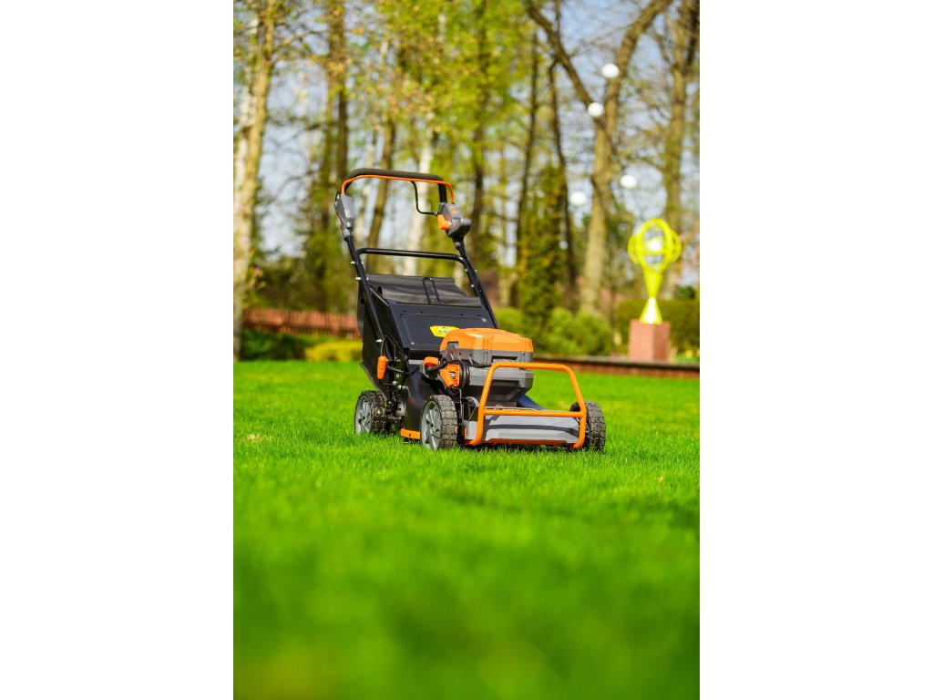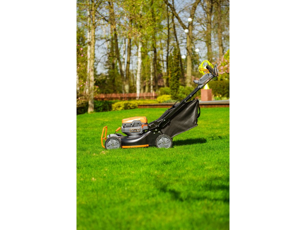 - Přes svou robustní konstrukci váží pouze 47,5 kg, což spolu s integrovaným pojezdem zajišťuje pohodlnou manipulaci i při delším sečení.