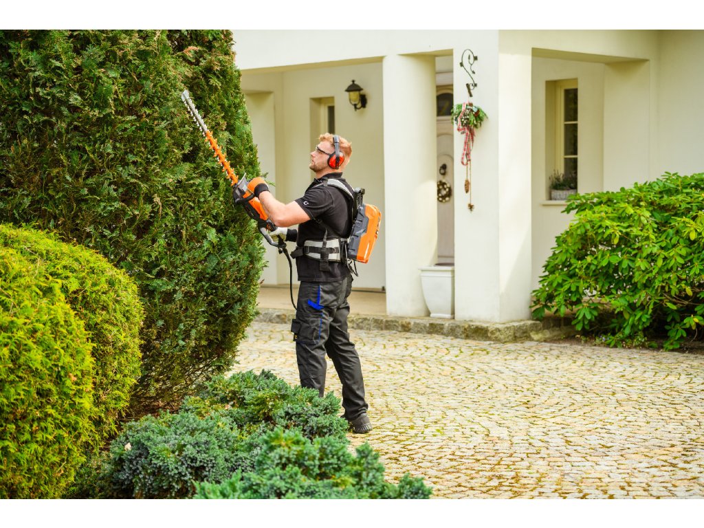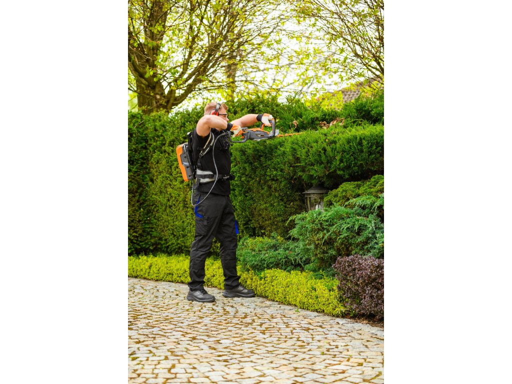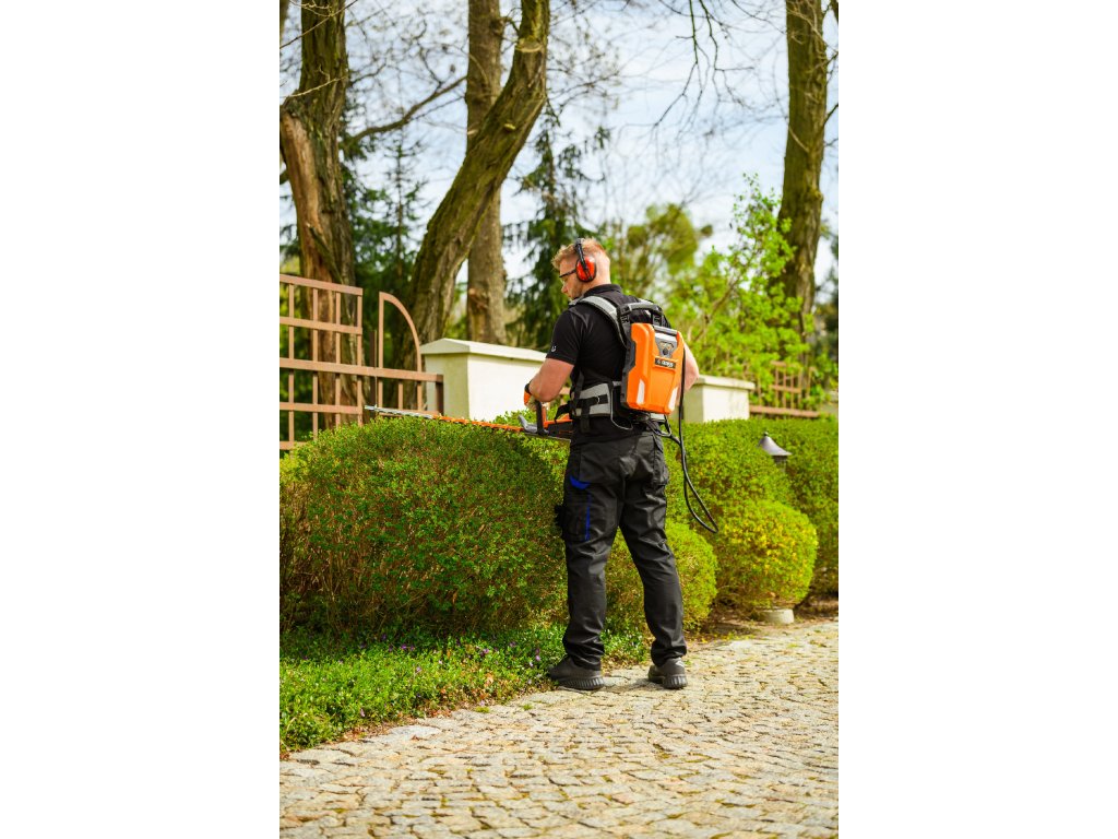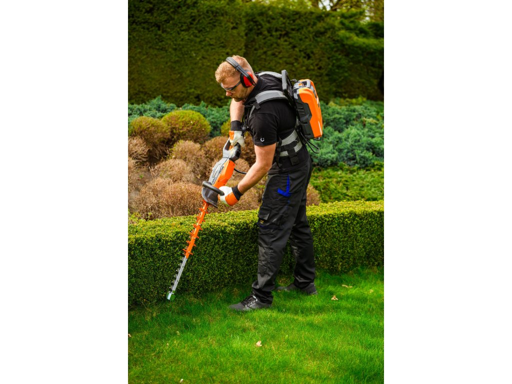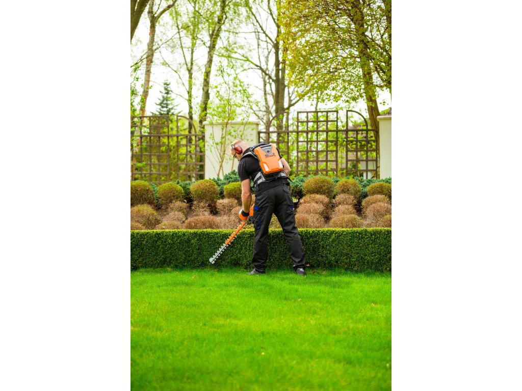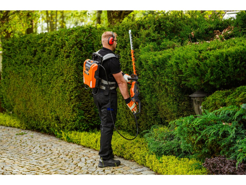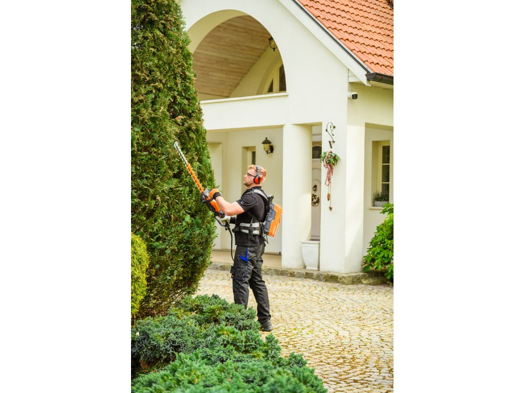 - Model HT640-P využívá napájení Plug-In, které umožňuje připojení k batohové baterii nebo přenosné baterii se systémem nosných popruhů, což znamená méně zátěže na ruce a delší pracovní dobu bez přerušení. Variabilní rychlost otáček (až 4000 ot./min) umožňuje přesné přizpůsobení práce různým typům dřevin.
