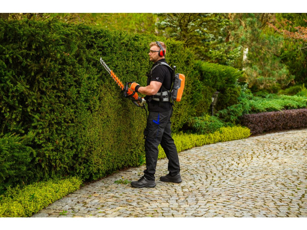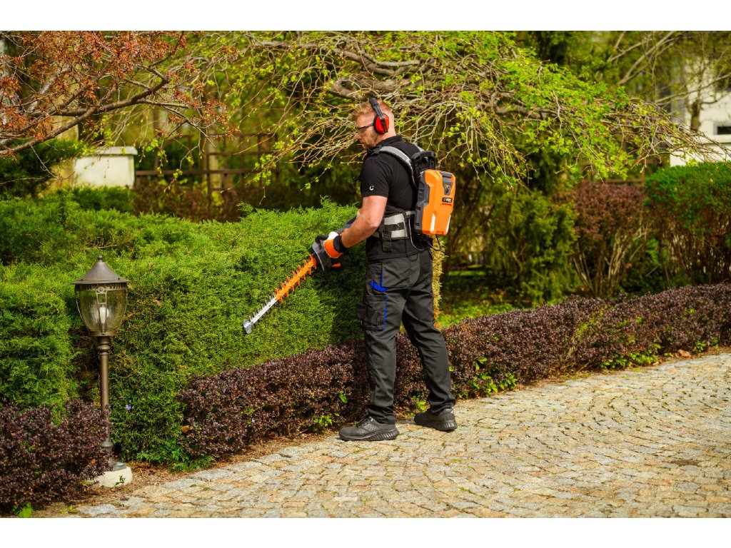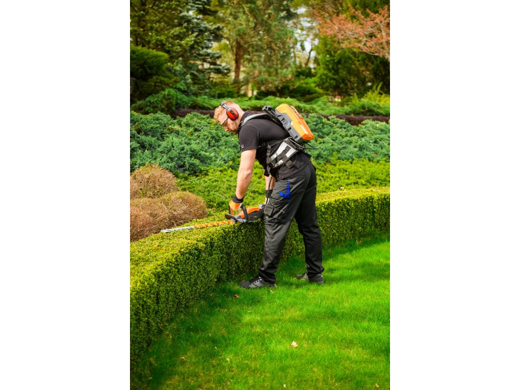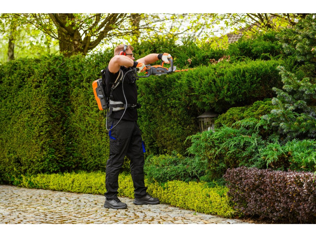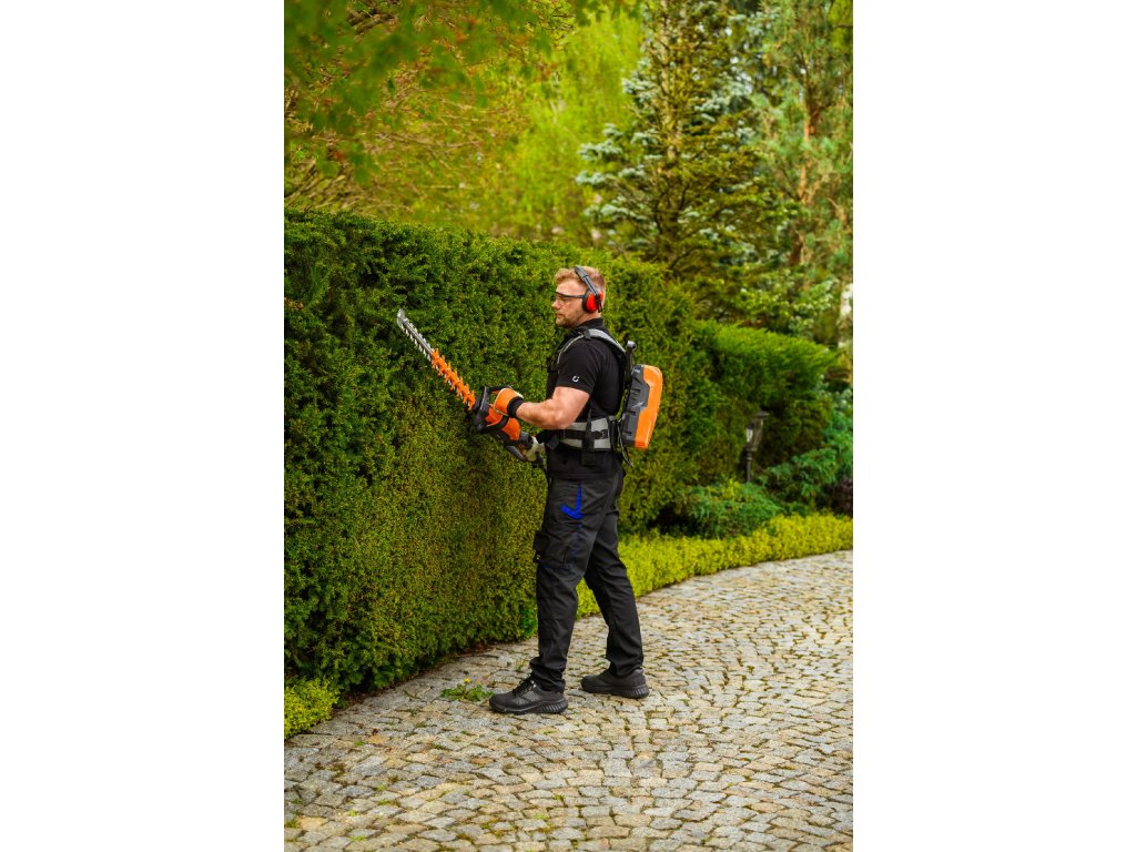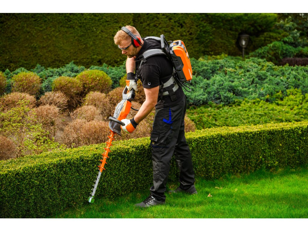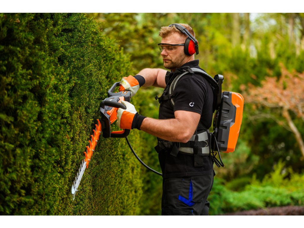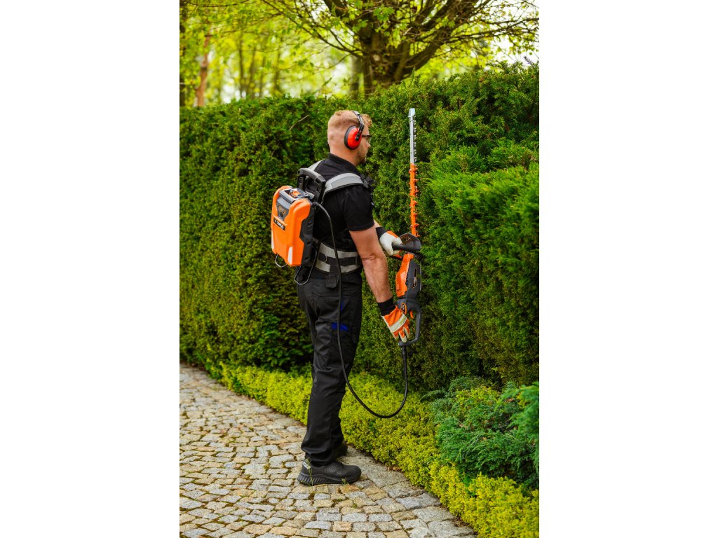 - Model HT640-P využívá napájení Plug-In, které umožňuje připojení k batohové baterii nebo přenosné baterii se systémem nosných popruhů, což znamená méně zátěže na ruce a delší pracovní dobu bez přerušení. Variabilní rychlost otáček (až 4000 ot./min) umožňuje přesné přizpůsobení práce různým typům dřevin.
