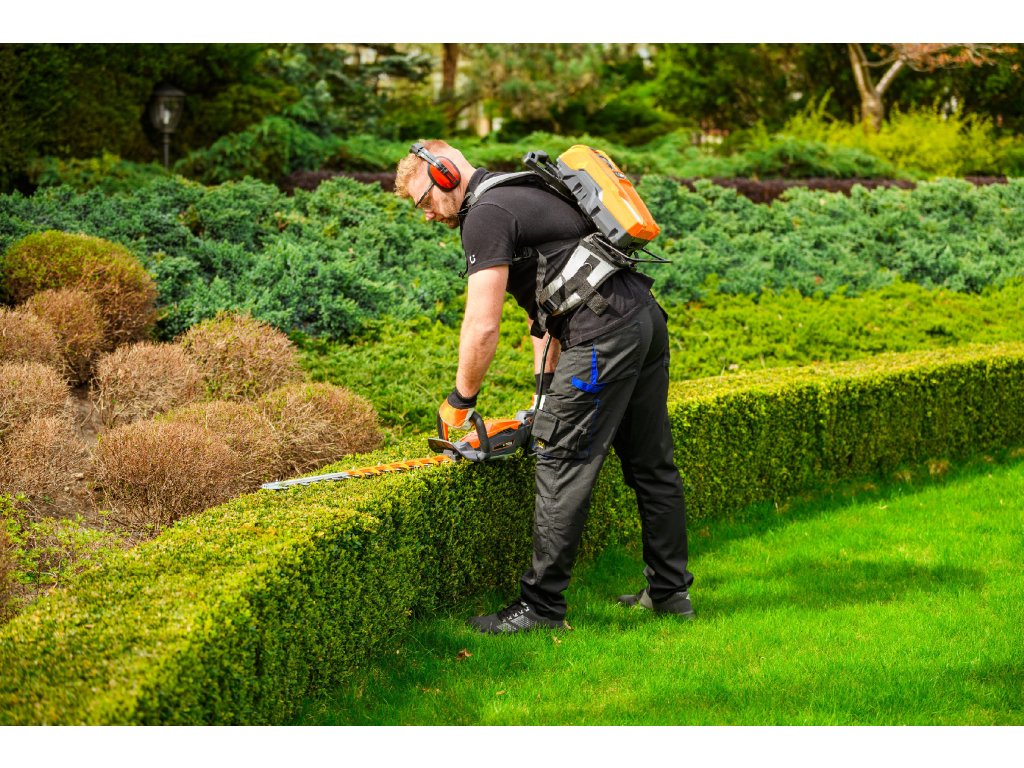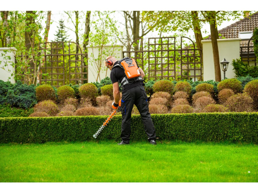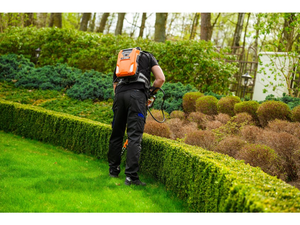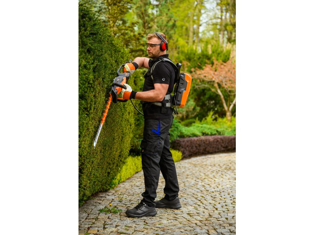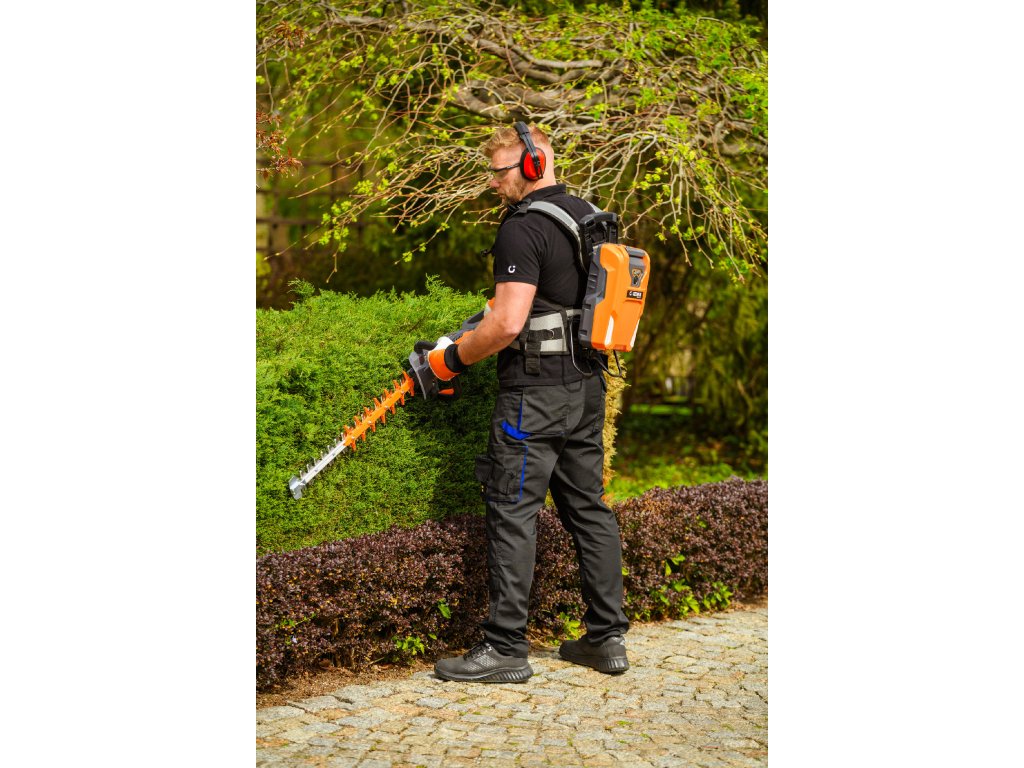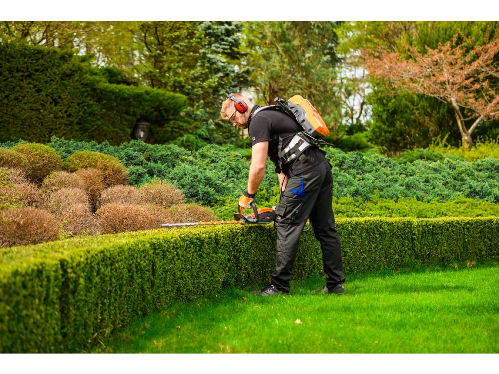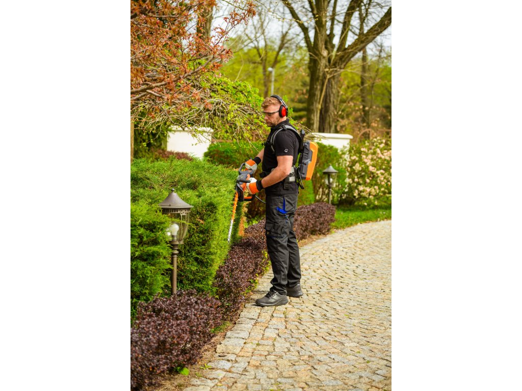 - Model HT640-P využívá napájení Plug-In, které umožňuje připojení k batohové baterii nebo přenosné baterii se systémem nosných popruhů, což znamená méně zátěže na ruce a delší pracovní dobu bez přerušení. Variabilní rychlost otáček (až 4000 ot./min) umožňuje přesné přizpůsobení práce různým typům dřevin.