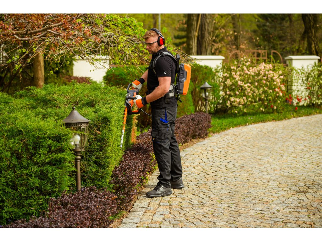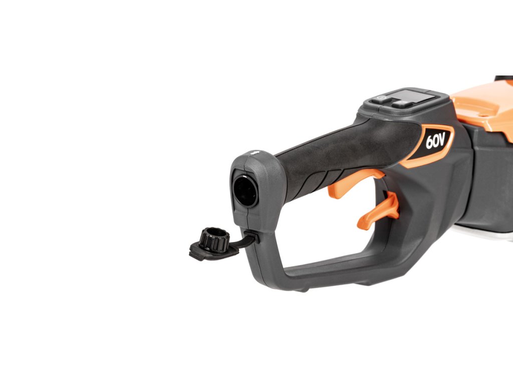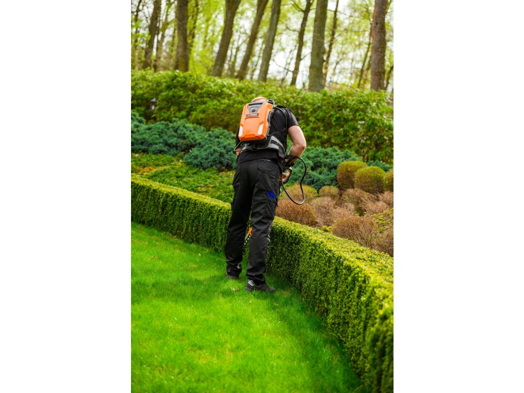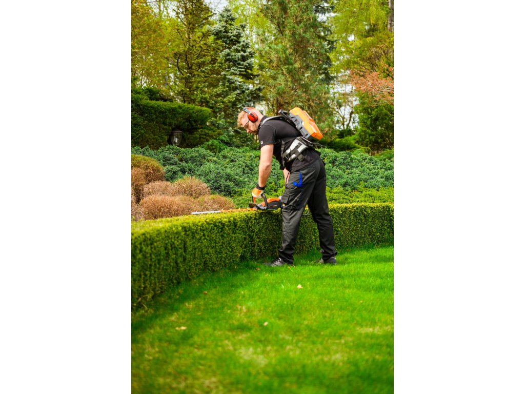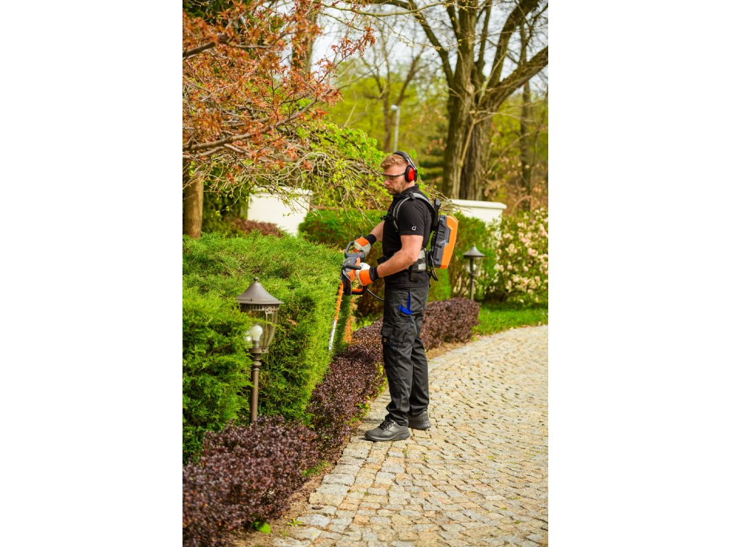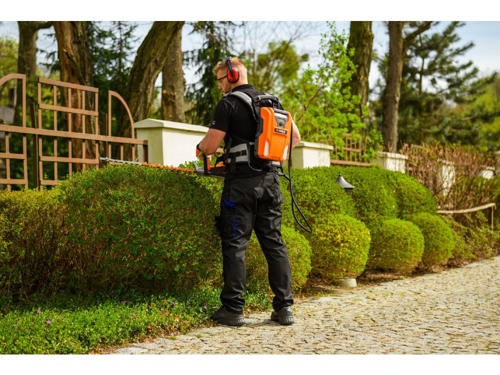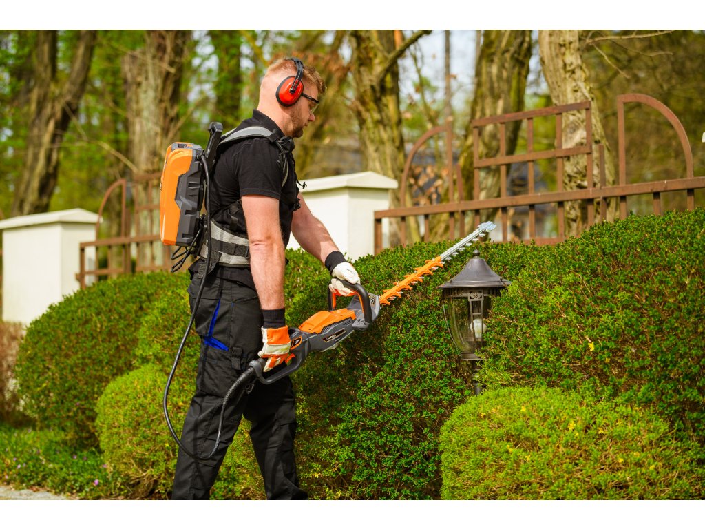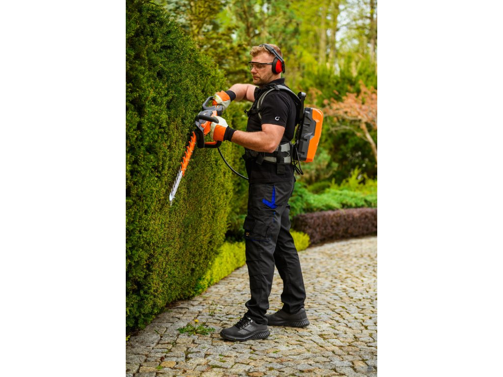 - Model HT640-P využívá napájení Plug-In, které umožňuje připojení k batohové baterii nebo přenosné baterii se systémem nosných popruhů, což znamená méně zátěže na ruce a delší pracovní dobu bez přerušení. Variabilní rychlost otáček (až 4000 ot./min) umožňuje přesné přizpůsobení práce různým typům dřevin.