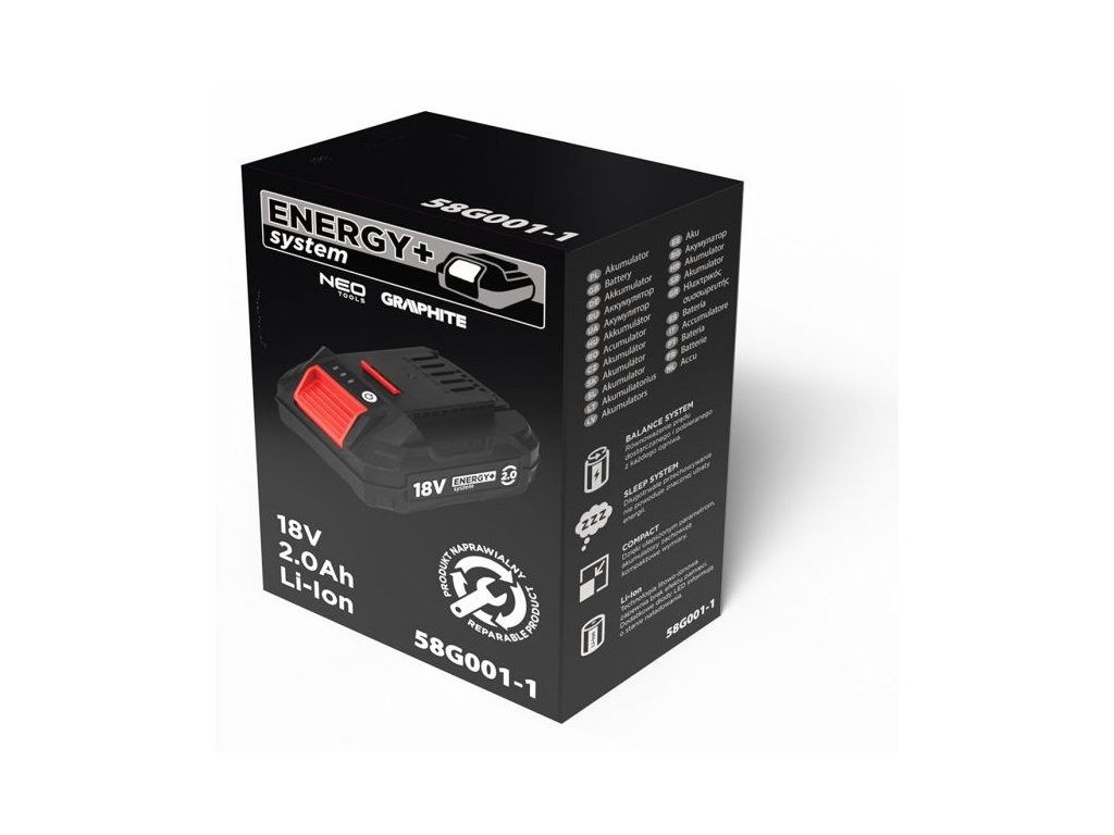 Dobíjecí baterie GRAPHITE Energy+ 58G001-1 je spolehlivý a výkonný napájecí článek určený pro všechna zařízení z platformy Energy+ 18 V. Díky kapacitě 2,0 Ah poskytuje dostatečný výkon pro běžné domácí i profesionální použití.
