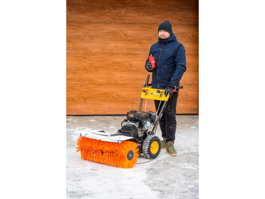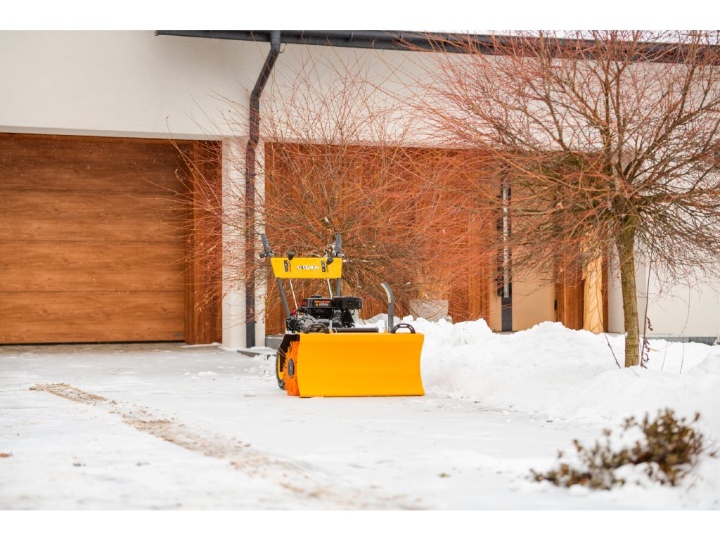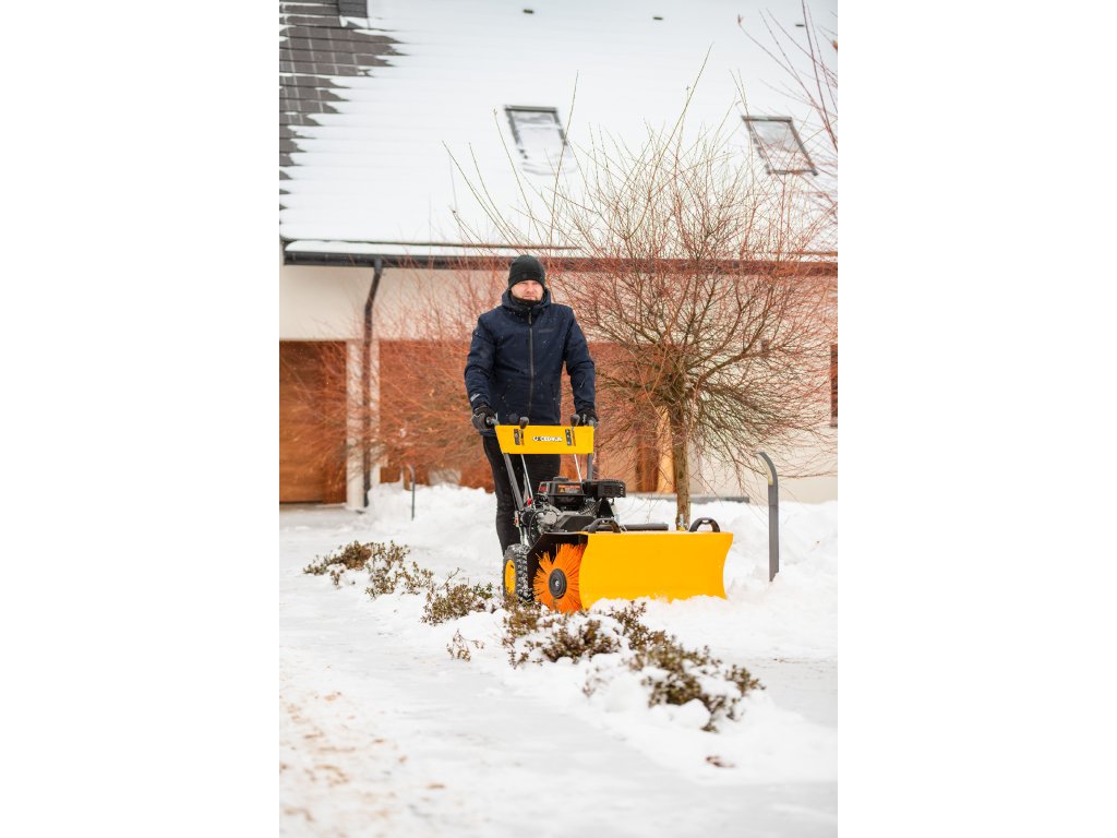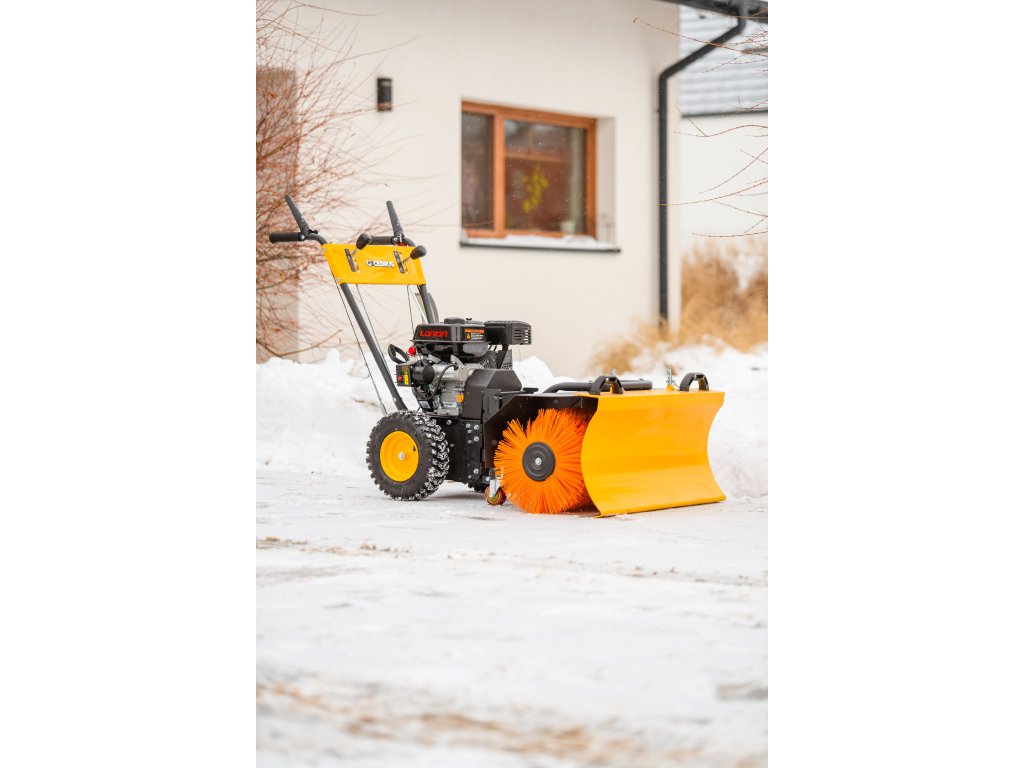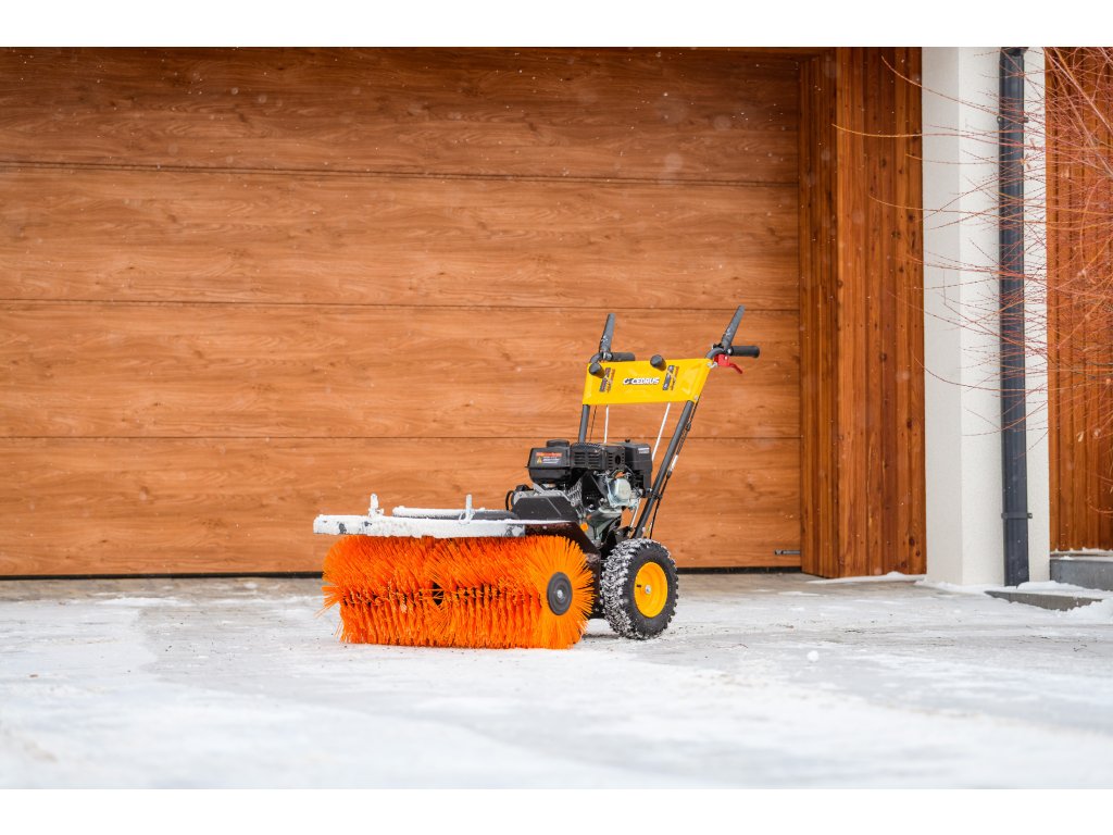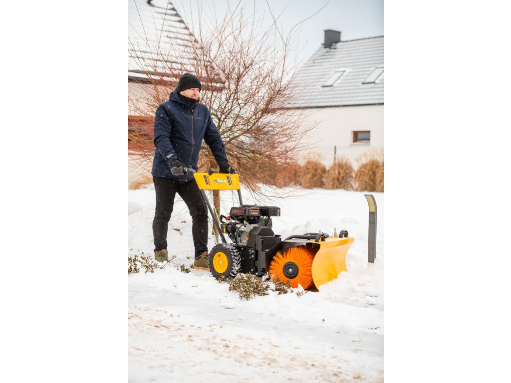 - Kromě elektrického startování (230 V) je vybaven nastavitelným úhlem zametání s možností otočení každých 15° z pozice operátora. Součástí balení je sněhový pluh a sběrná nádoba na nečistoty.
