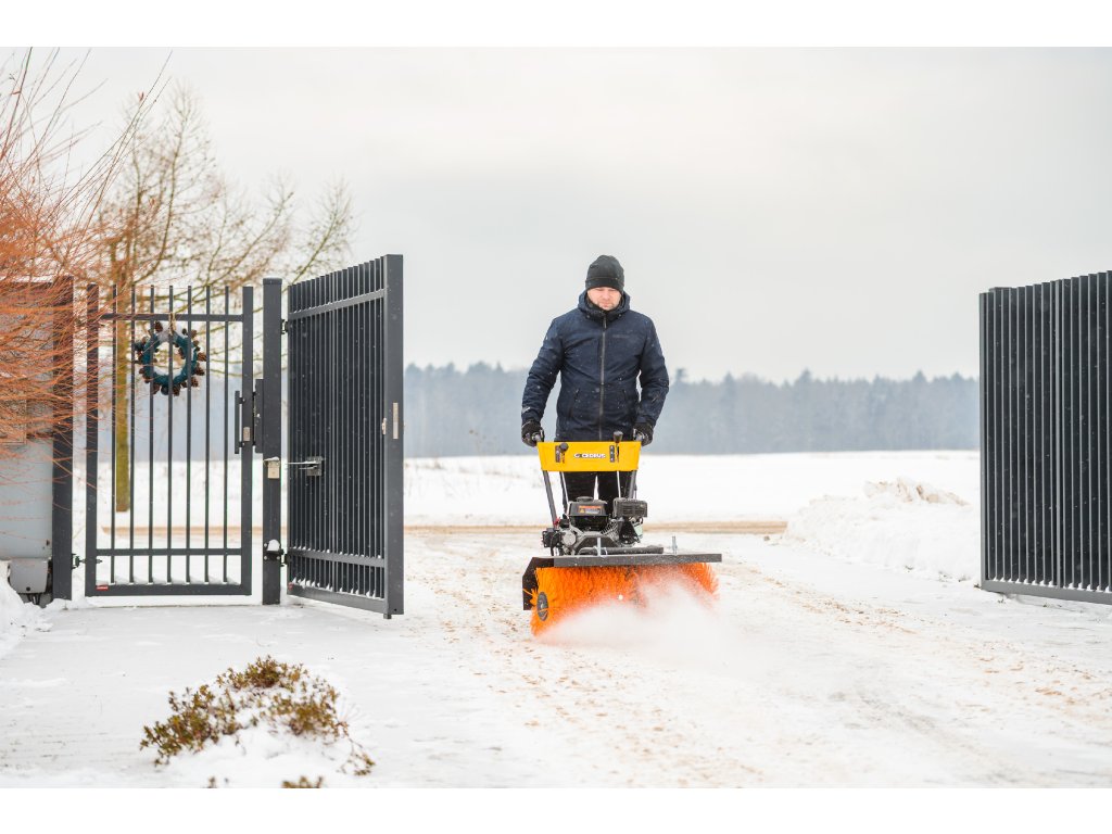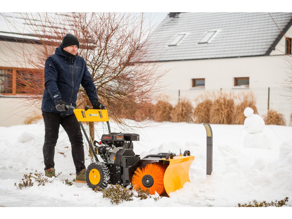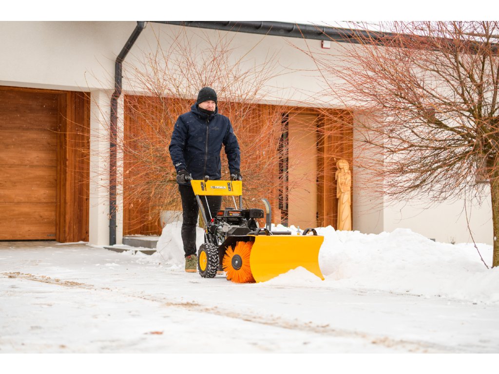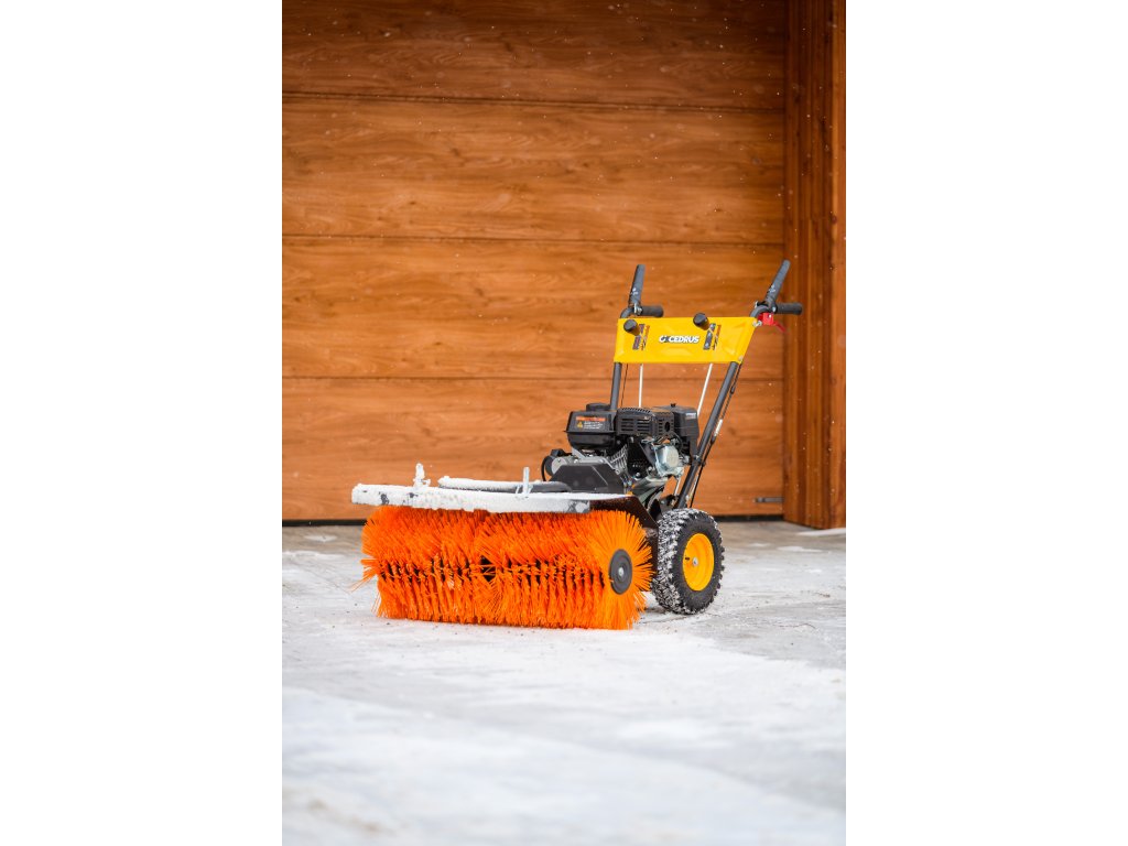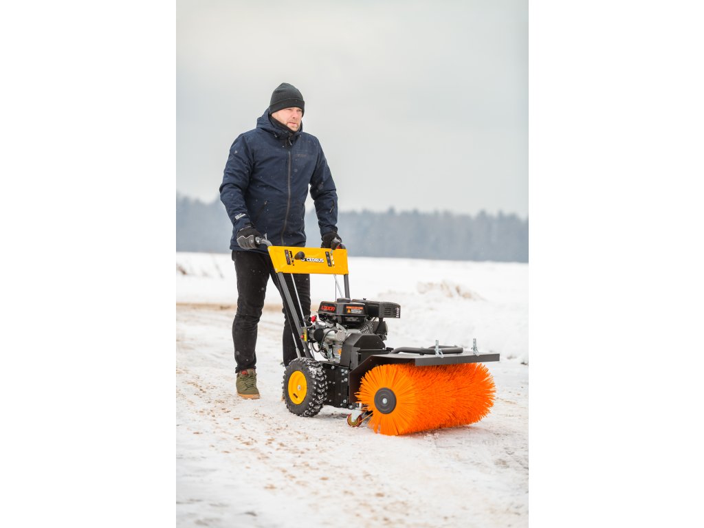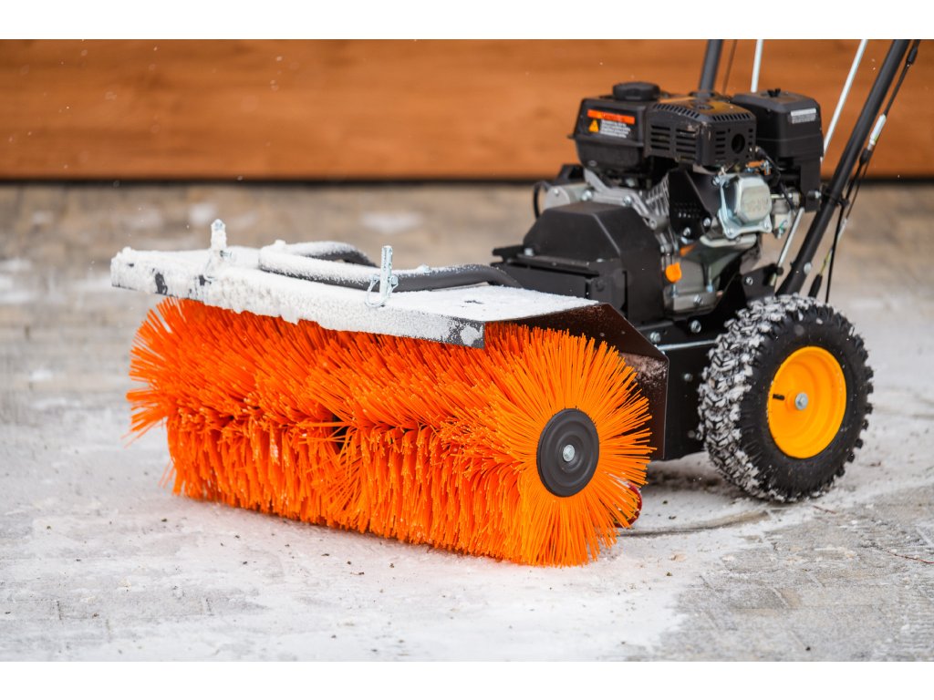- Kromě elektrického startování (230 V) je vybaven nastavitelným úhlem zametání s možností otočení každých 15° z pozice operátora. Součástí balení je sněhový pluh a sběrná nádoba na nečistoty.