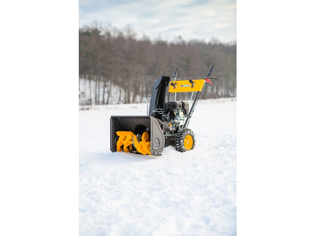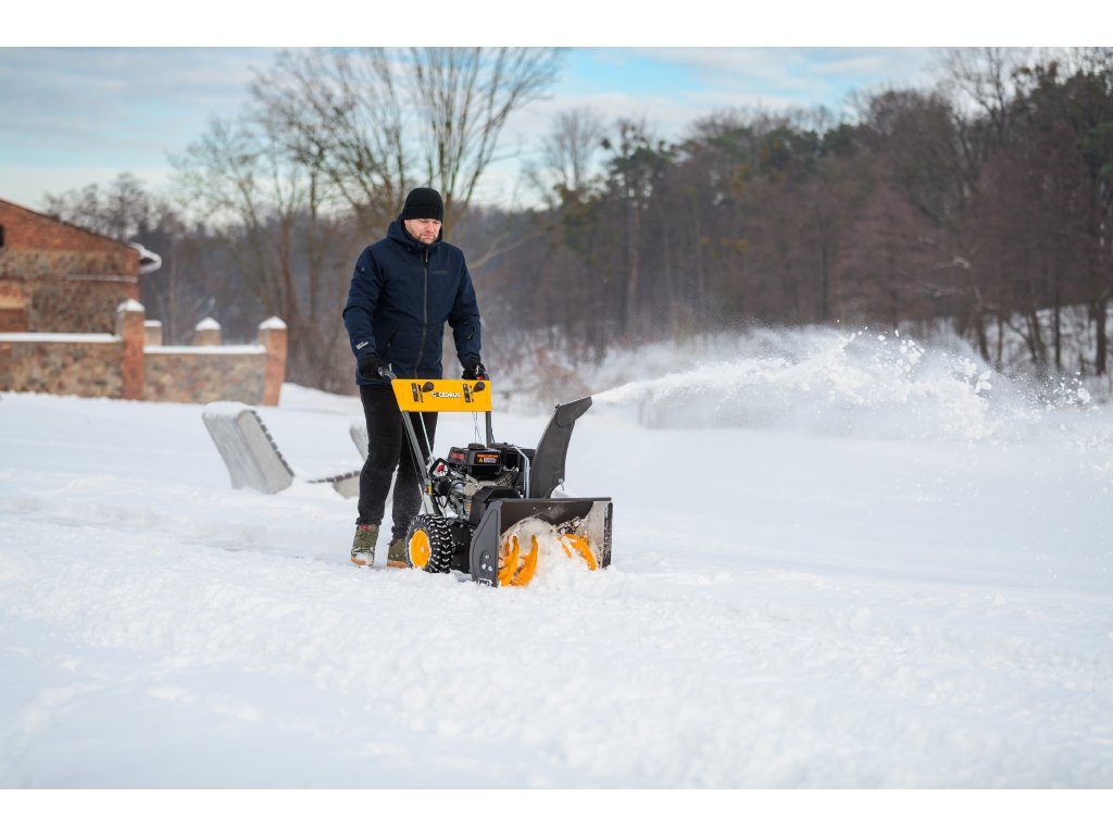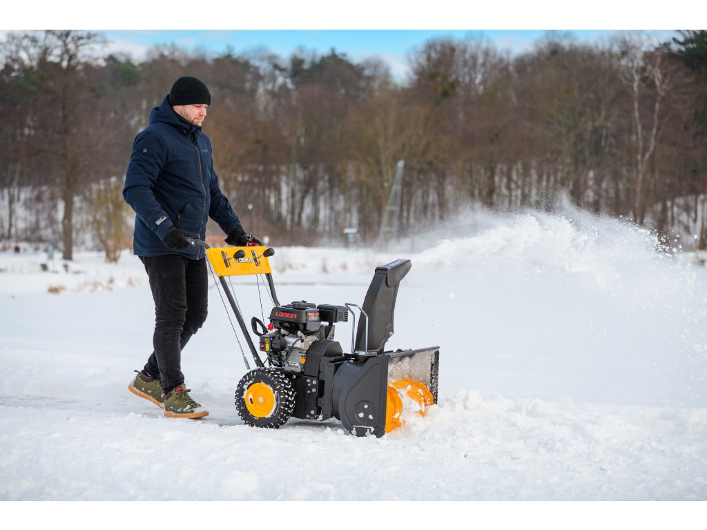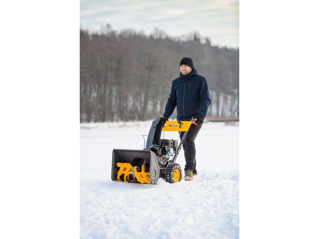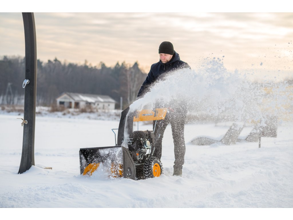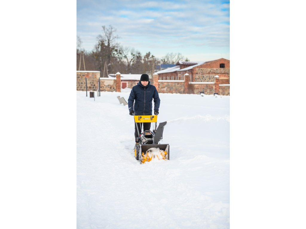 - Kromě elektrického startování (230 V) je vybaven nastavitelným úhlem zametání s možností otočení každých 15° z pozice operátora. Součástí balení je sněhový pluh a sběrná nádoba na nečistoty.