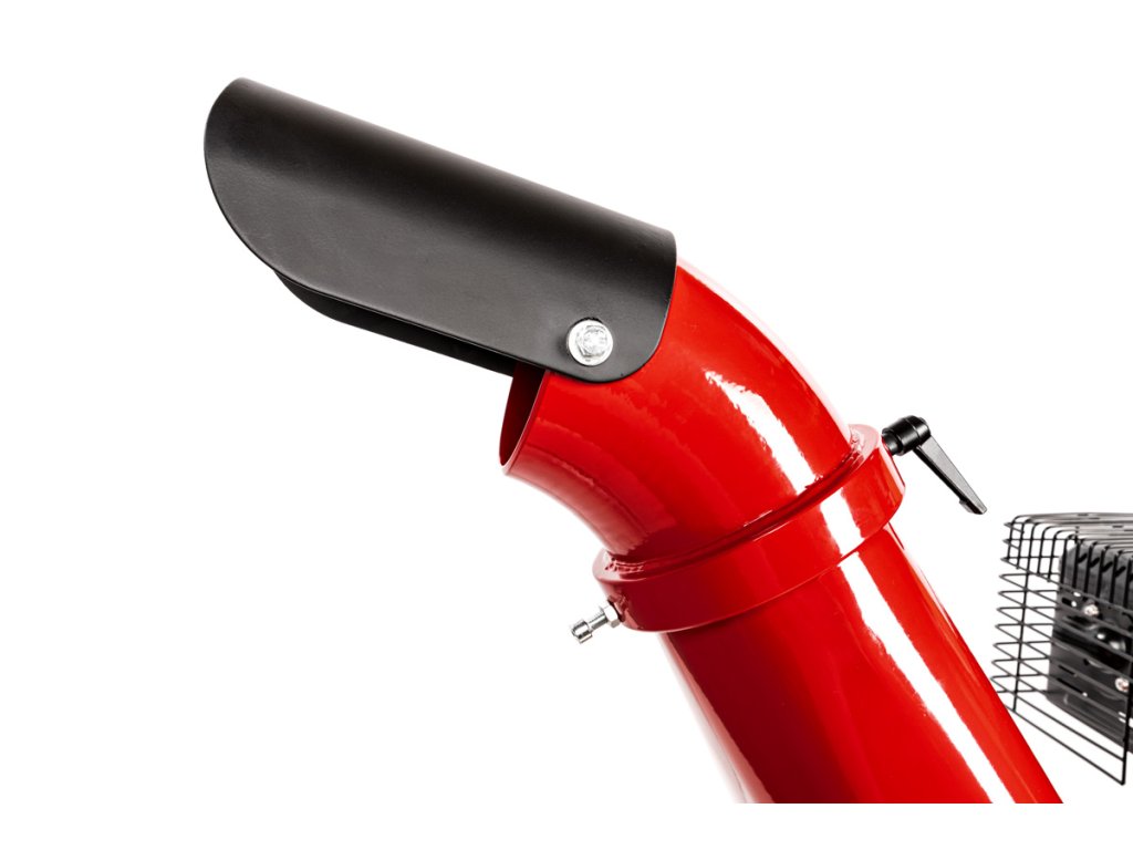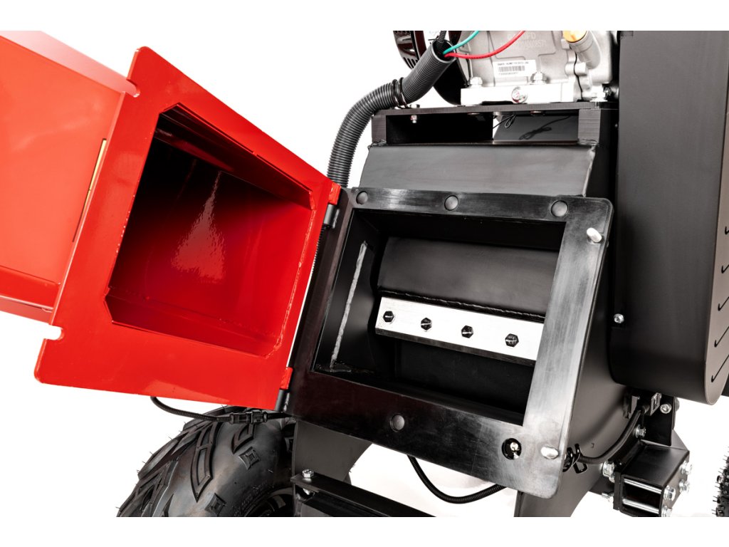 - Štěpkovač je vybaven nastavitelným výhozem, který umožňuje přizpůsobit směr vyhazovaných třísek. Dvojitý řemenový pohon zajišťuje spolehlivý a hladký chod. Pro bezpečnost obsluhy je stroj vybaven dvěma bezpečnostními spínači, jedním u vstupního otvoru a druhým u řezacího systému.