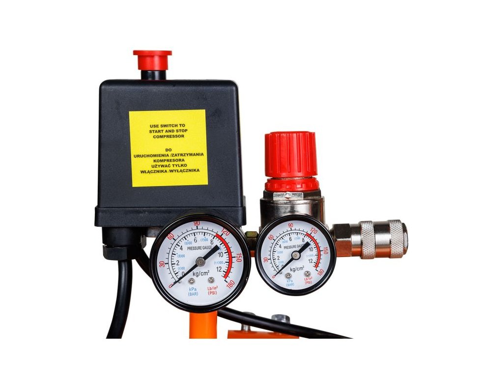 Přístroj disponuje kulovým vypouštěcím ventilem, dvěma výstupy, snadno přístupnými ovládacími prvky a regulací tlaku. Robustní madlo umožňuje pohodlné přenášení i manipulaci. Je určen pro práci se širokým spektrem pneumatického nářadí.