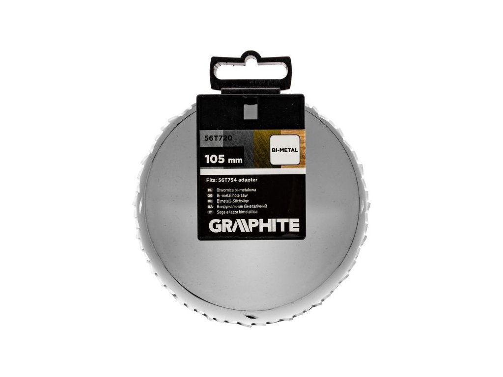 Bimetalová děrovka GRAPHITE 56T720 o průměru 105 mm je vyrobena z kvalitní rychlořezné oceli HSS, která zajišťuje vysokou odolnost a dlouhou životnost. Díky výšce 44 mm umožňuje vrtání do hloubky 38 mm. Je opatřena závitem 5/8'' x 18 UNF a je vhodná pro použití s vrtačkou nebo aku vrtačkou/šroubovákem.