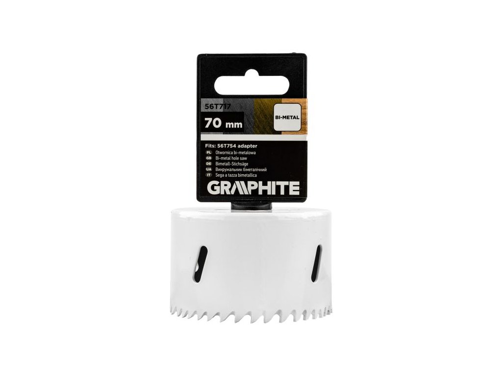 Bimetalová děrovka GRAPHITE 56T717 o průměru 70 mm a výšce 44 mm je vyrobena z kvalitní rychlořezné oceli HSS, která poskytuje čistý řez a dlouhou životnost. Umožňuje vrtání do hloubky 38 mm a je opatřena závitem 5/8'' x 18 UNF. Je určena pro použití s klasickými vrtačkami nebo aku vrtačkami/šroubováky.