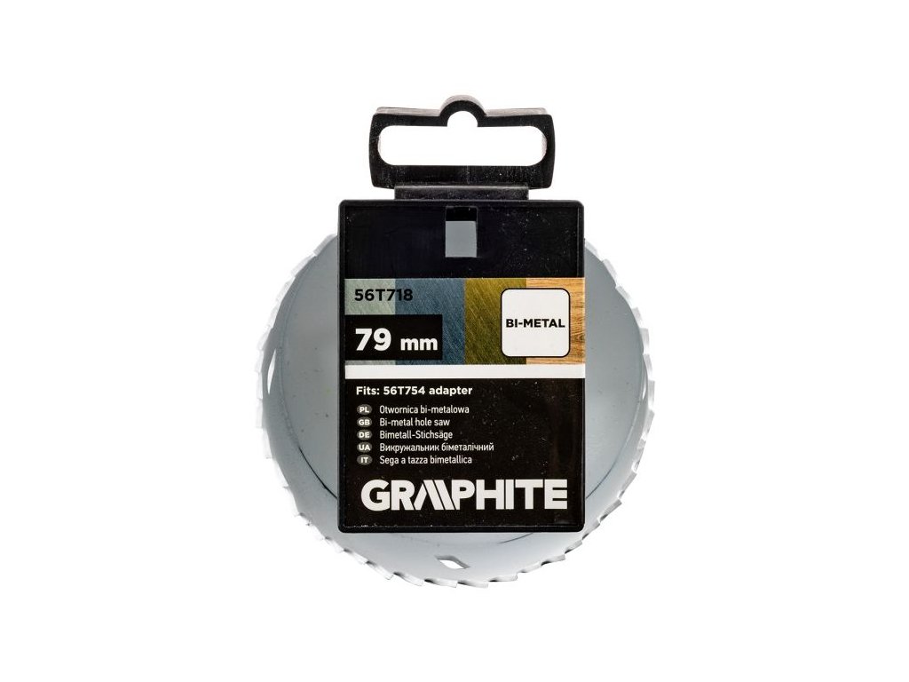 Bimetalová děrovka GRAPHITE 56T718 o průměru 79 mm a výšce 44 mm je vyrobena z odolné rychlořezné oceli HSS, která poskytuje dlouhou životnost a čistý řez. Umožňuje vrtání do hloubky 38 mm a je opatřena závitem 5/8'' x 18 UNF. Je určena pro použití s klasickou vrtačkou nebo aku vrtačkou/šroubovákem.