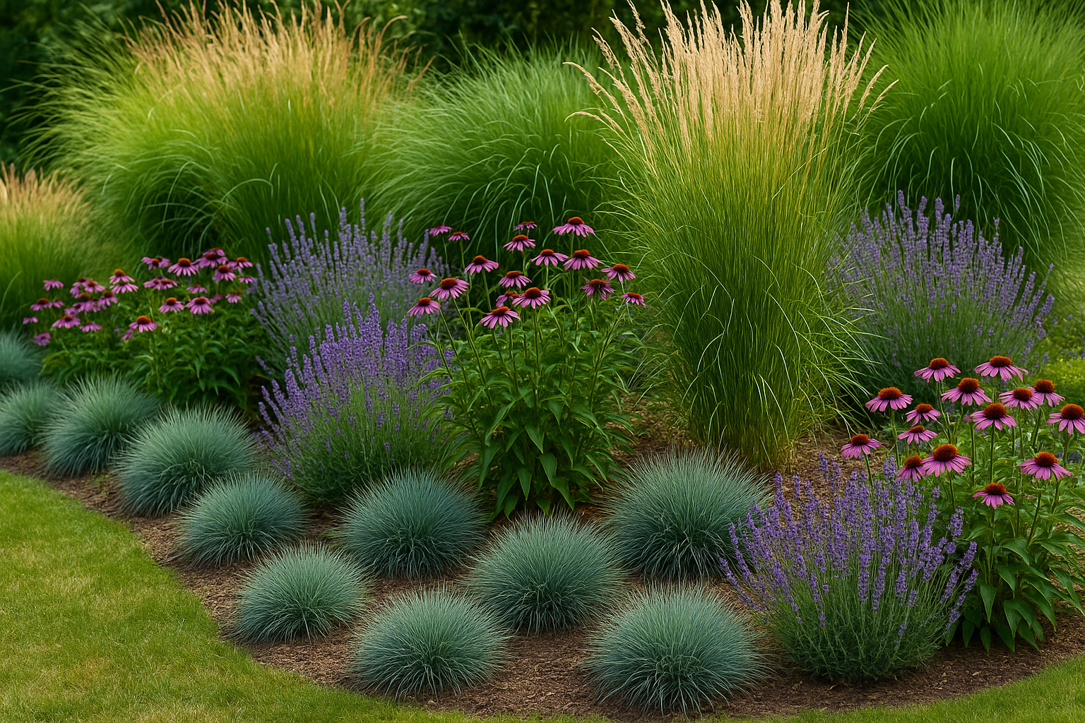 - Nízké trávy (kostřava, ostřice) + levandule, šalvěj, echinacea – jemný kontrast v barvě i struktuře.