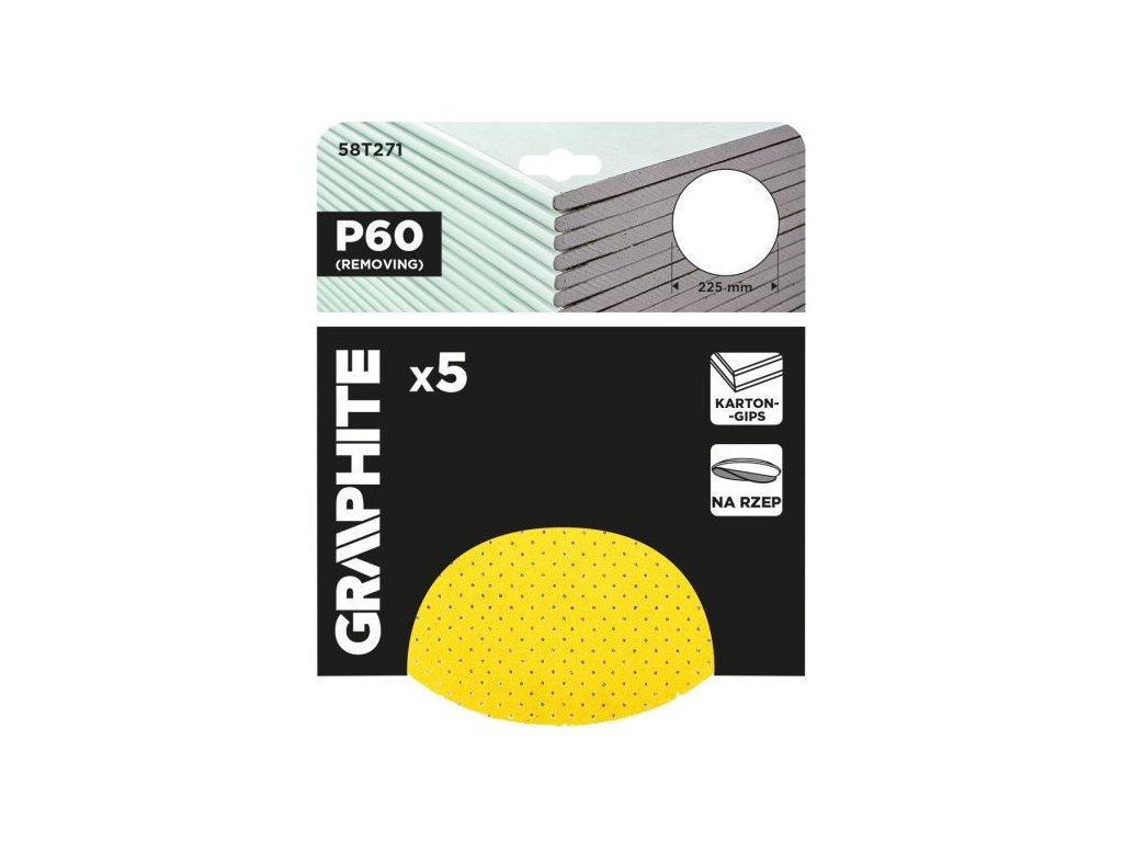 Sada brusných kotoučů GRAPHITE 58T271 obsahuje 5 kusů kotoučů o průměru 225 mm se zrnitostí P60. Jsou ideální pro středně hrubé broušení omítek a sádrokartonových desek. Díky perforovaným otvorům po celé ploše je brusný prach efektivně odváděn, což zlepšuje čistotu práce a snižuje riziko přehřívání brusné plochy.