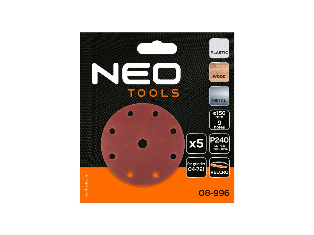 Brusné kotouče 150 mm, P240, 5 ks, s 9 otvory pro 04-721, 08-996 od NEO TOOLS je sada 5 kusů brusných kotoučů o průměru 150 mm, doporučených pro excentrickou brusku s číslem dílu 04-721.