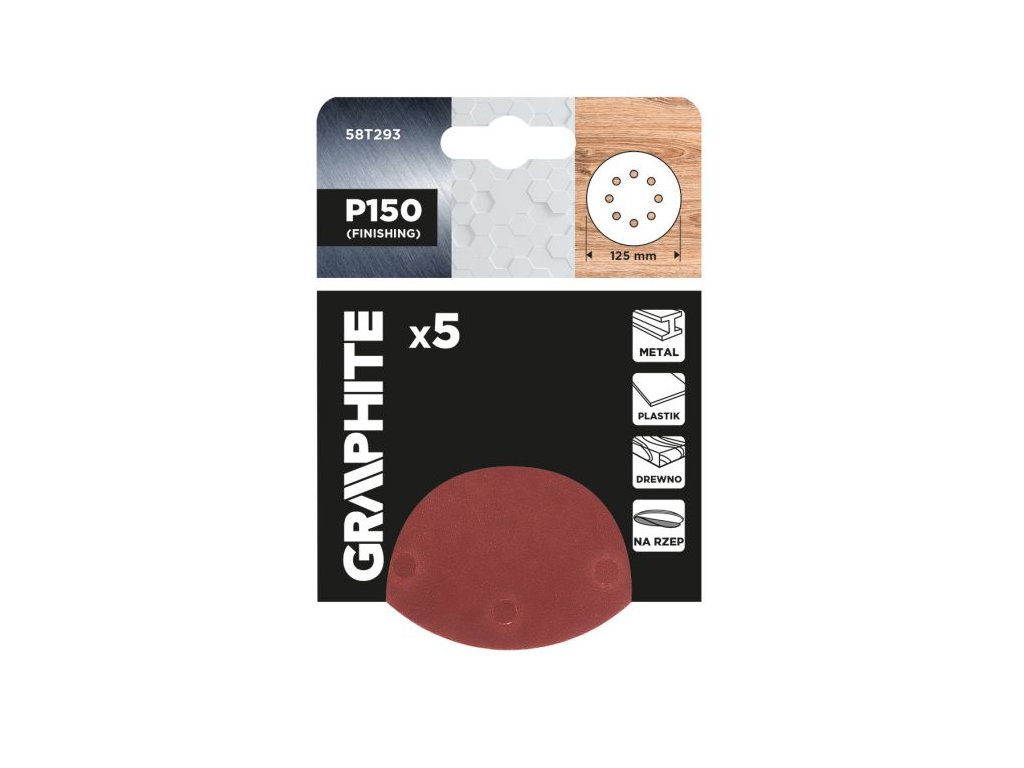 Sada brusných kotoučů GRAPHITE 58T293 obsahuje 5 kusů kotoučů o průměru 125 mm se zrnitostí P150. Kotouče jsou vybaveny 8 otvory, které účinně odvádějí brusný prach a zajišťují čistší práci i delší životnost brusiva. Díky systému upevnění na suchý zip je výměna kotoučů rychlá a jednoduchá.
