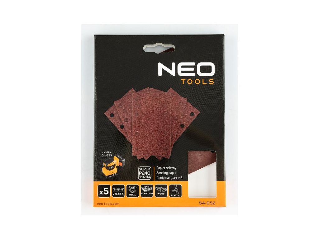 Brusné papíry NEO TOOLS 80 × 130 mm, P240 (5 ks) jsou skvělým pomocníkem pro detailní a dokončovací práce, vhodné pro kutily i profesionály.