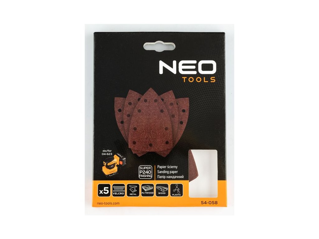 Brusné papíry NEO TOOLS 54-057 jsou obdélníkové brusné listy o rozměrech 100 × 147 mm se zrnitostí P120. Balení obsahuje 5 kusů a je doporučeno zejména pro použití s orbitální bruskou NEO TOOLS 04-623.