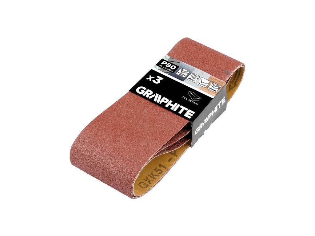 Sada nekonečných brusných pásů GRAPHITE 58T362 obsahuje 3 kusy pásů o rozměrech 75 × 457 mm se zrnitostí P80. Jsou určeny pro strojní použití v pásových bruskách a hodí se k opracování dřeva, kovu, plastu i sádrokartonu.