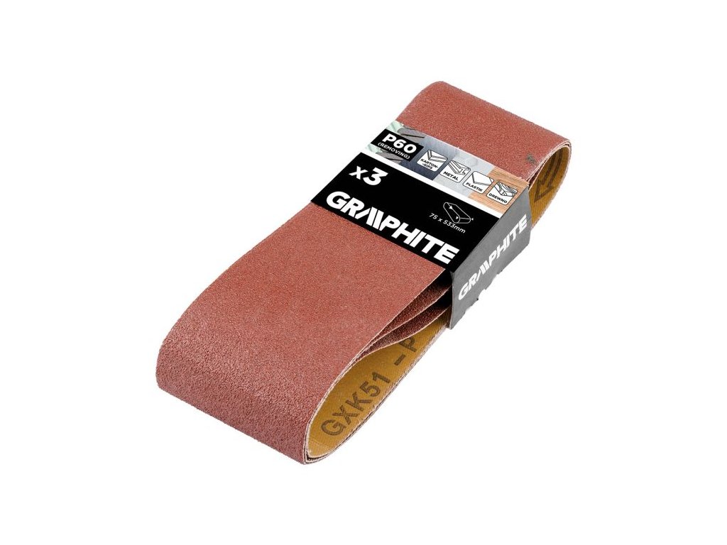 Sada nekonečných brusných pásů GRAPHITE 58T367 obsahuje 3 kusy pásů o rozměrech 75 × 533 mm se zrnitostí P60. Jsou určeny pro pásové brusky a doporučují se pro broušení a opracování dřeva, kovu, plastu a sádrokartonu.
