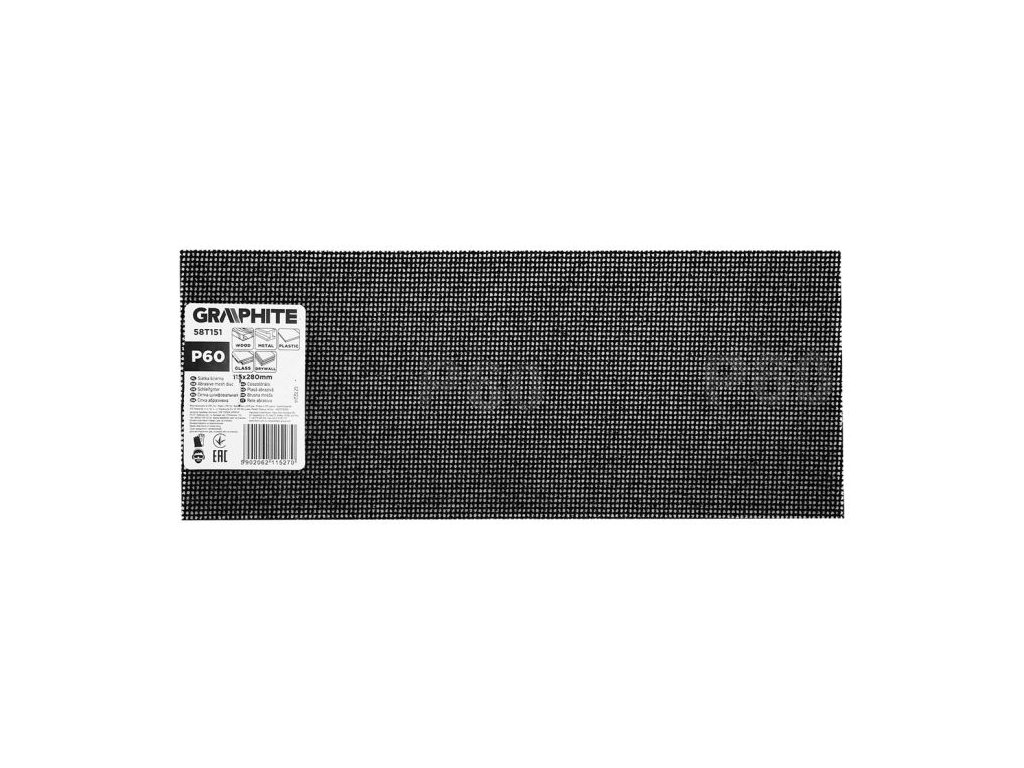 Brusná mřížka GRAPHITE 58T151 o rozměrech 115 × 280 mm se zrnitostí P60 je určena pro středně hrubé ruční broušení materiálů, jako je dřevo, kov, plast, sklo a sádrokarton.