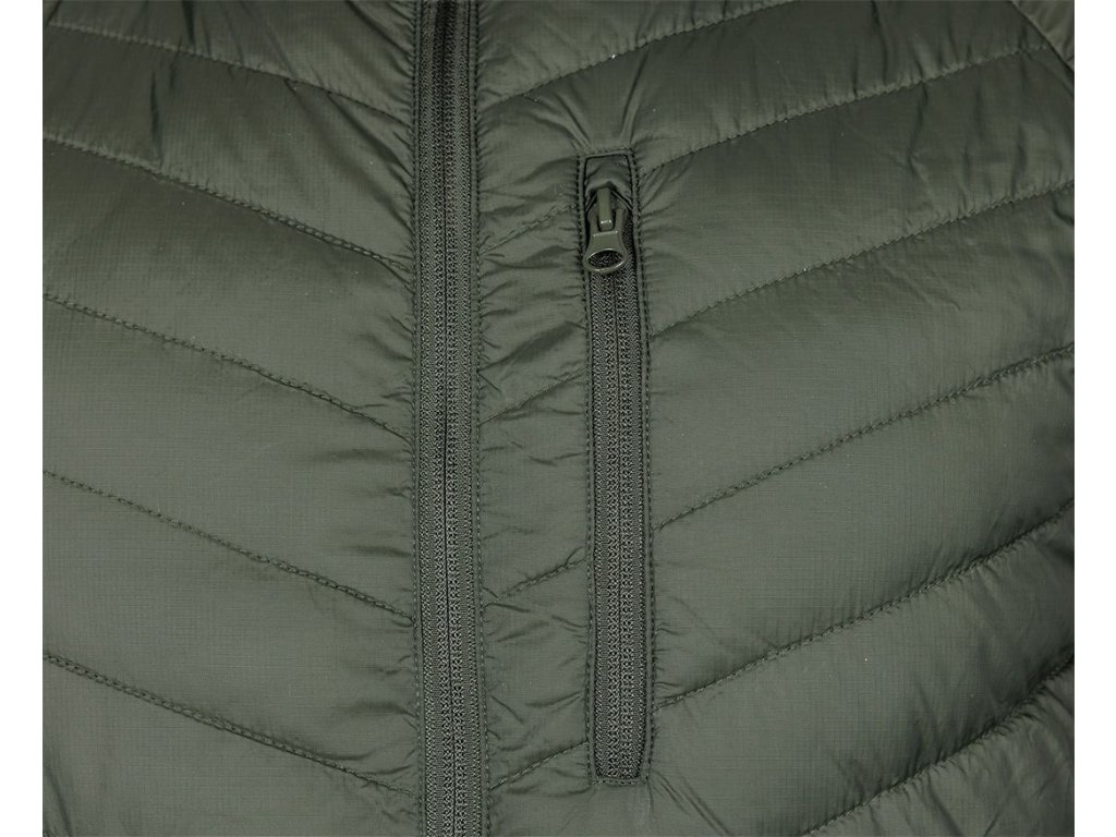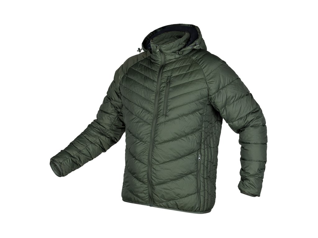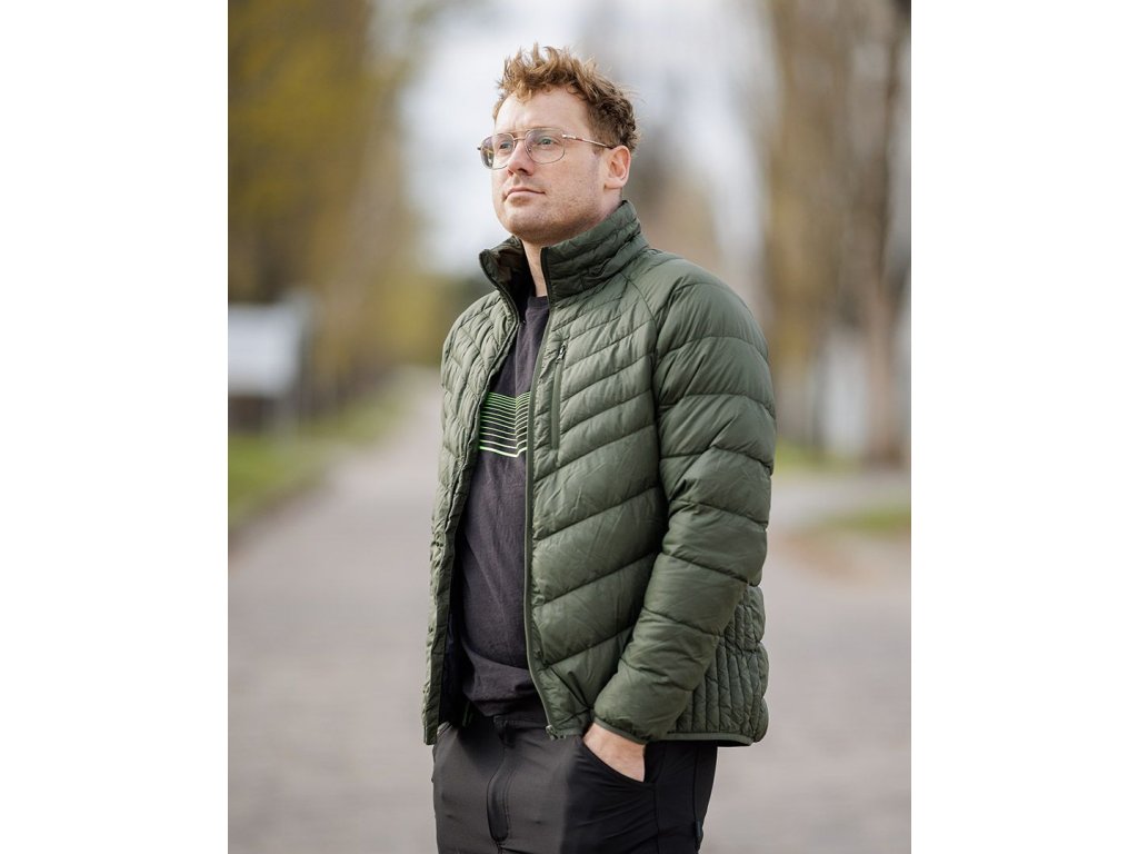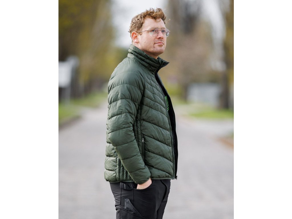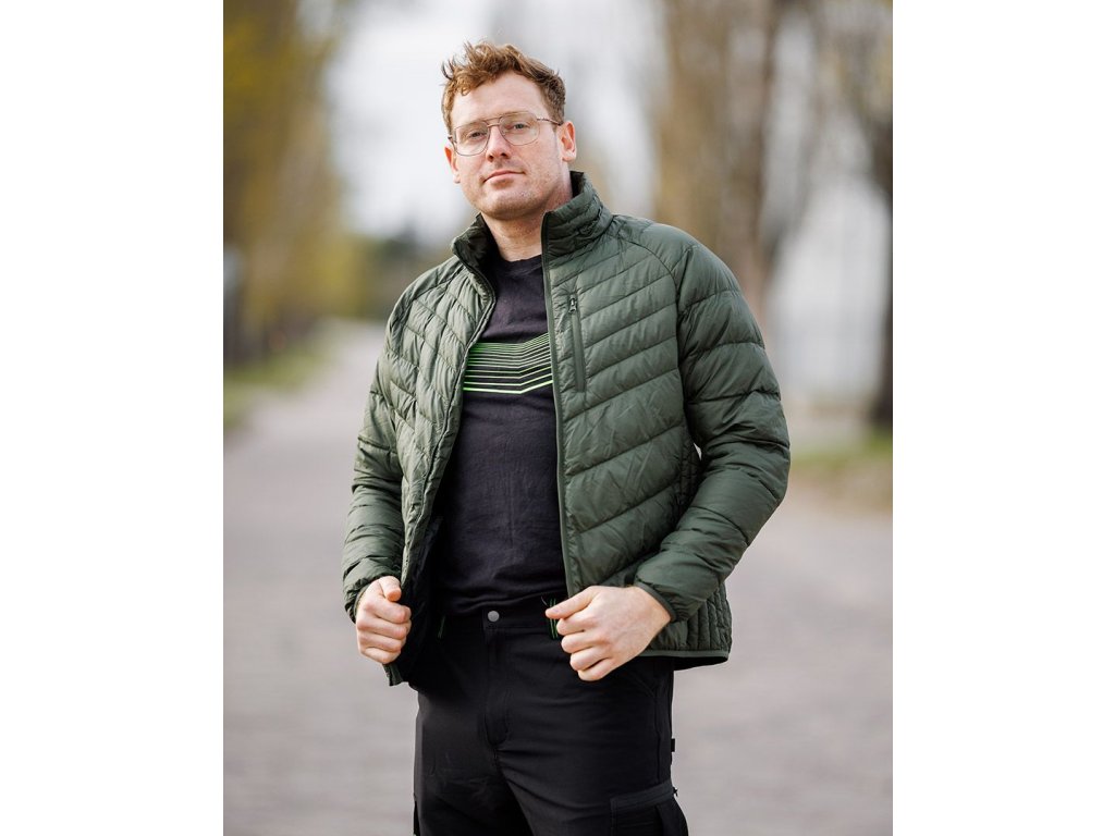 Tato olivově černá pracovní bunda je vyrobena ze 100% nylonu a zateplená polyesterovou výplní, která poskytuje optimální tepelný komfort bez zbytečné hmotnosti. Materiál typu ripstop zvyšuje odolnost proti protržení. Bunda je vybavena odnímatelnou kapucí, třemi kapsami na zip a elastickými lemy v rukávech pro větší pohodlí při nošení.