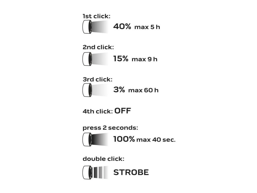 Tělo je vyrobeno z hliníku. Svítilna má 5 světelných funkcí: 100%, 40%, 15%, 3% a stroboskop.