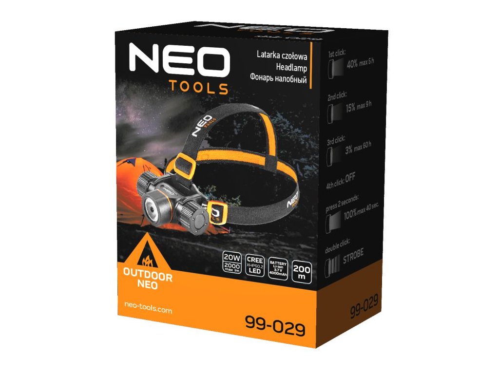 Dobíjecí čelovka NEO (ref. 99-029) je vybavena CREE XPG3 LED s výkonem 20W a maximálním dosahem 200m.