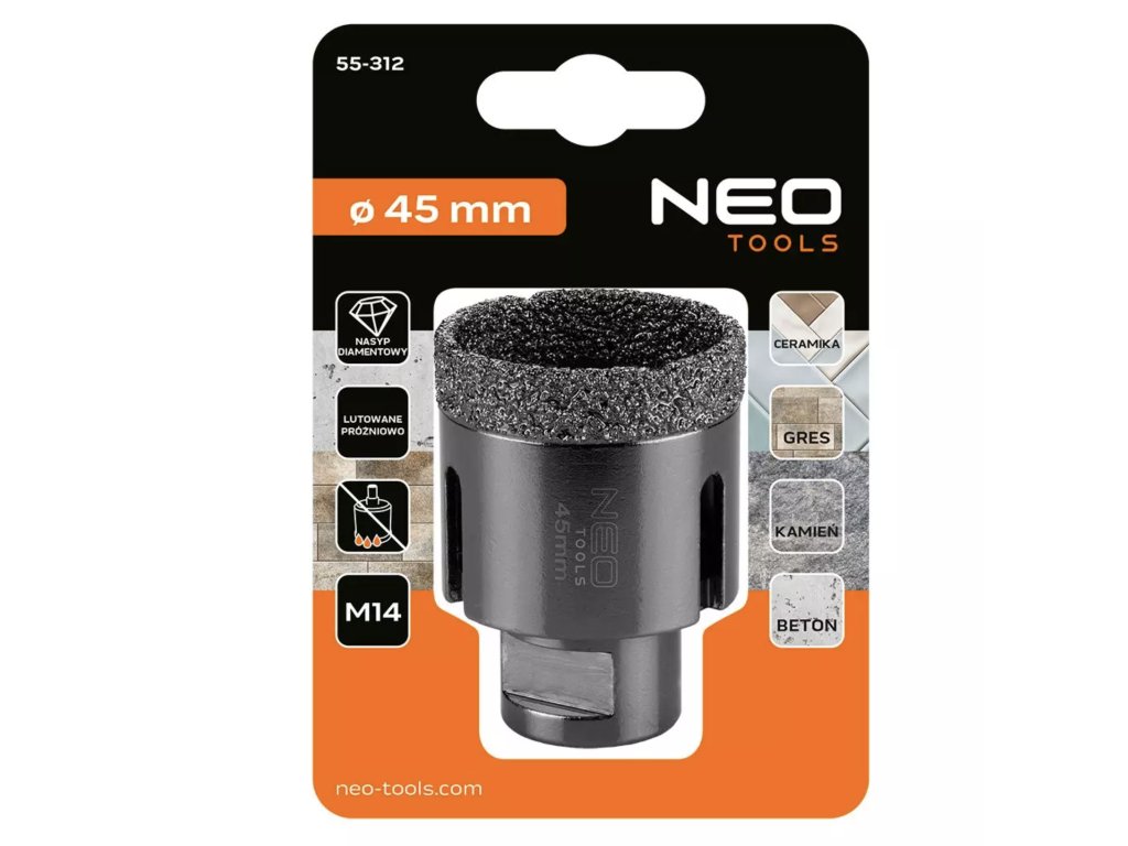 Profesionální diamantová děrovka NEO TOOLS 55-312 je navržena pro přesné vrtání otvorů většího průměru v tvrdých a povrchově upravených materiálech bez nutnosti chlazení vodou. Průměr 45 mm je ideální pro instalační a montážní práce v koupelnách, kuchyních, technických místnostech i při dokončovacích stavebních pracích.