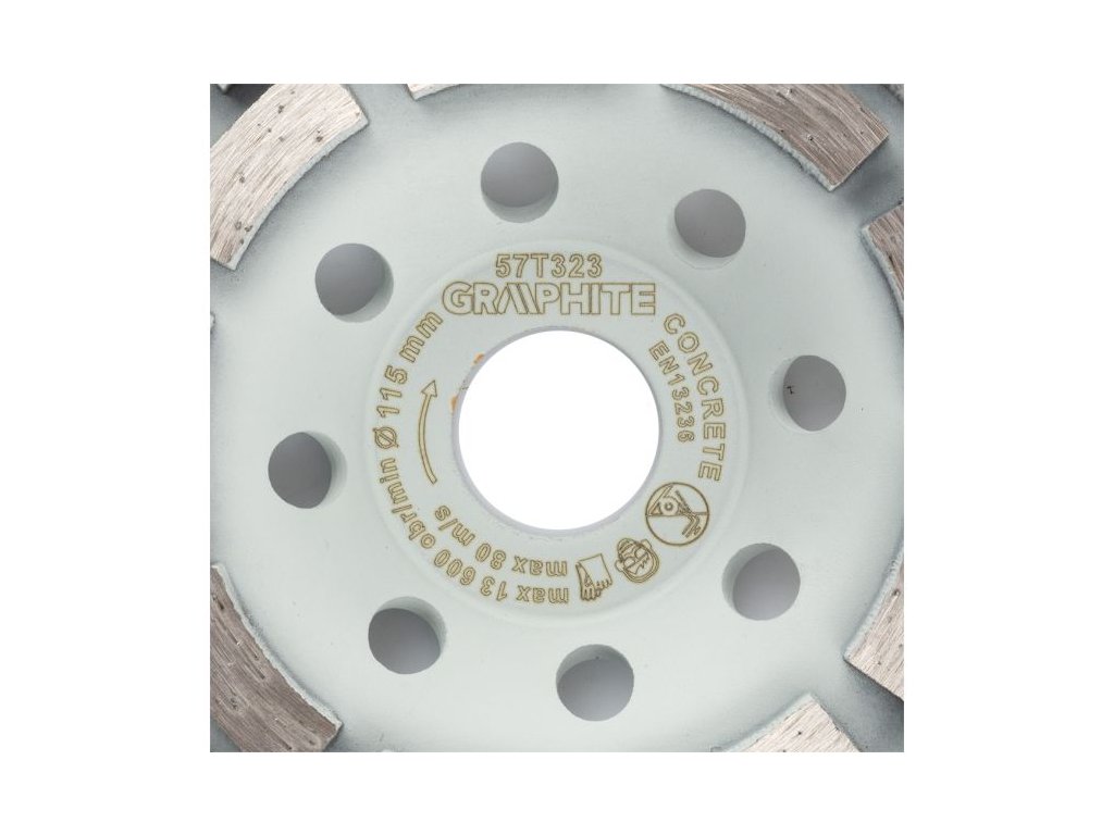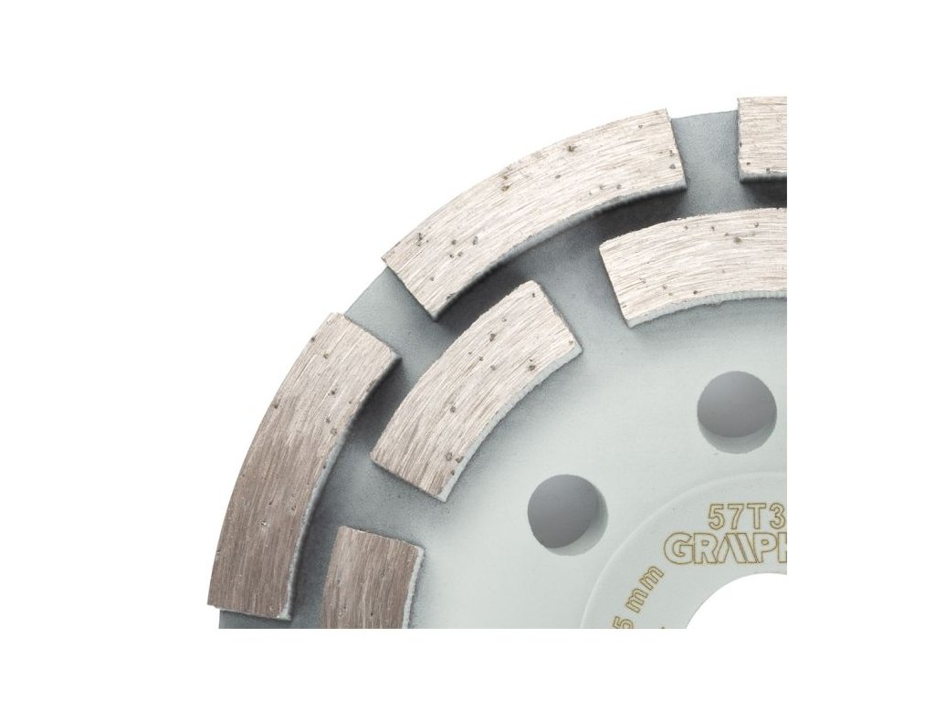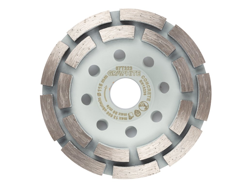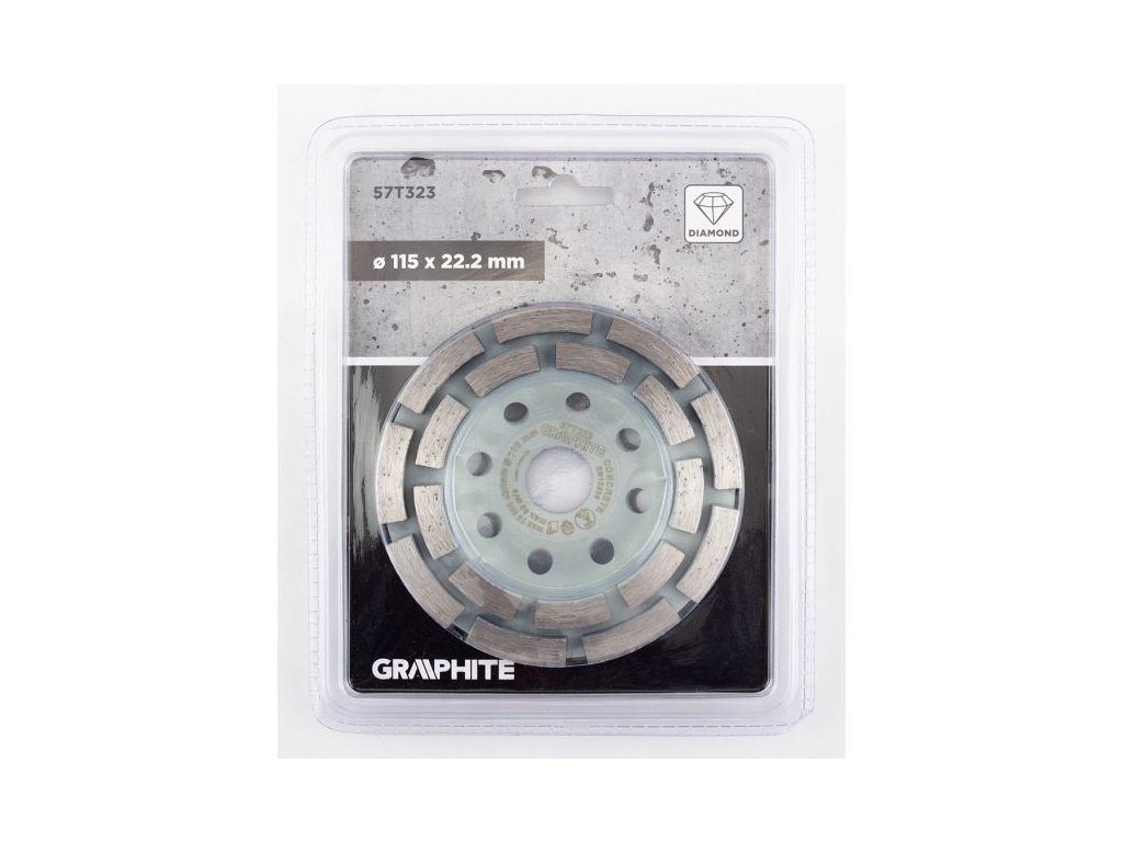 Diamantový brusný kotouč GRAPHITE 57T323 (Ø 115 × 22,2 mm) s dvěma segmenty je profesionální nástroj navržený pro rychlé a efektivní broušení tvrdých stavebních materiálů, jako je beton, pórobeton, cihly a přírodní kámen.