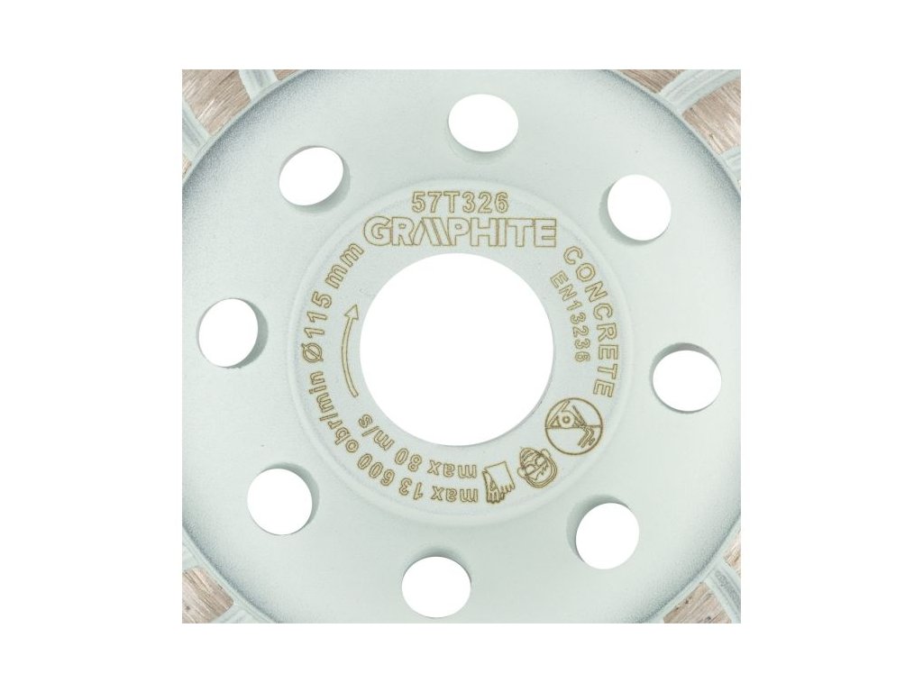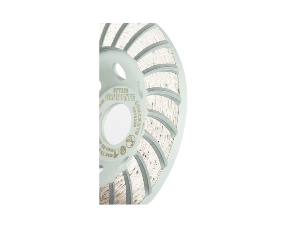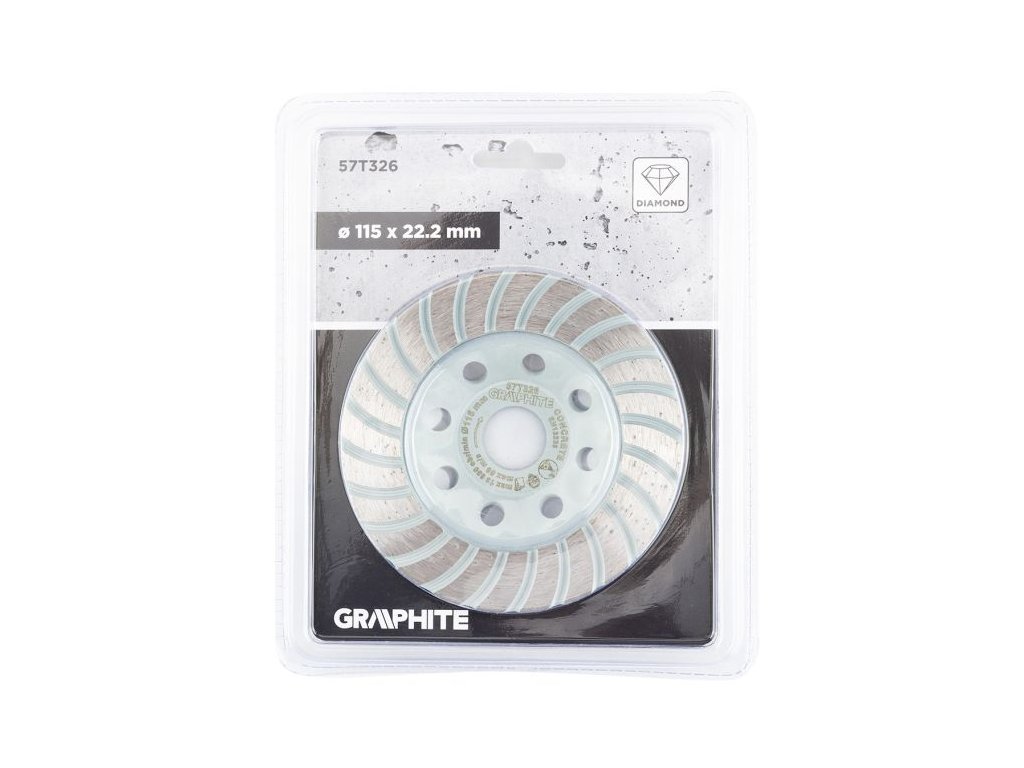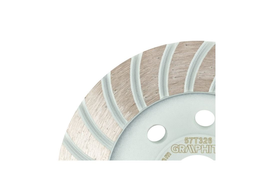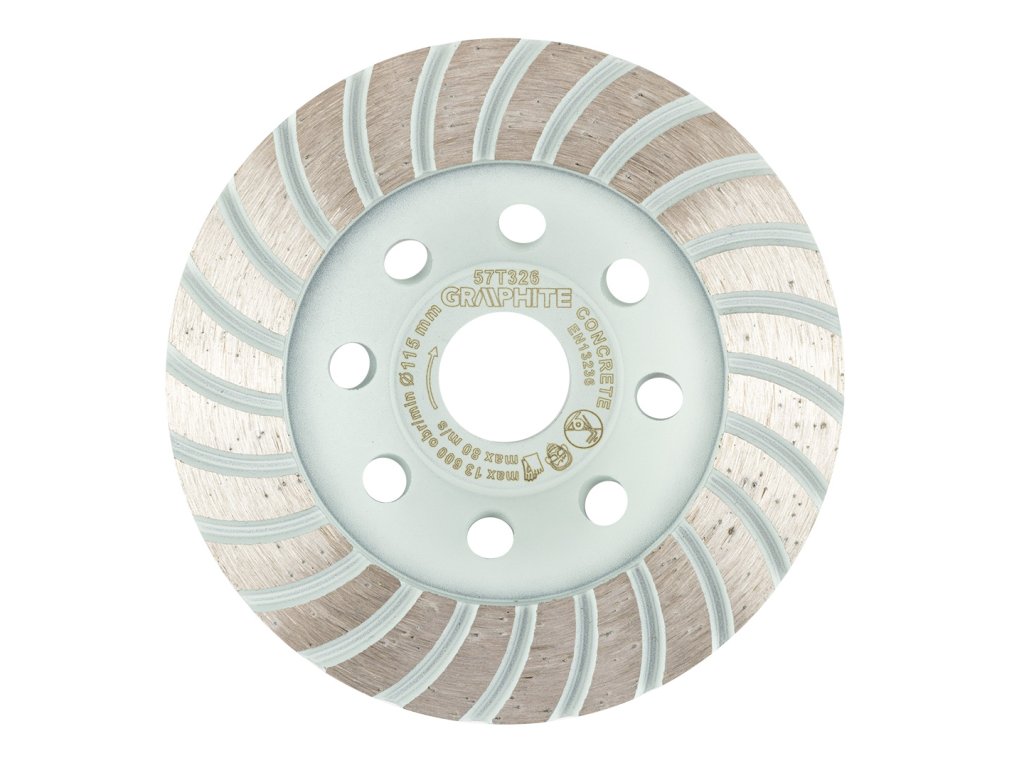 Diamantový brusný kotouč GRAPHITE 57T326 (Ø 115 × 22,2 mm) v provedení turbo je určen pro rychlé a efektivní broušení tvrdých stavebních materiálů, jako je beton, pórobeton, cihly a přírodní kámen.