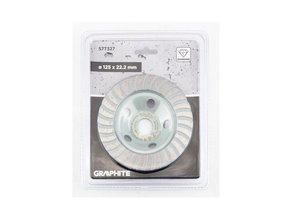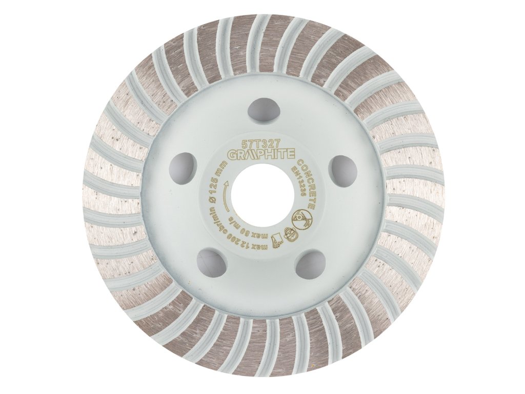Diamantový brusný kotouč GRAPHITE 57T327 (Ø 125 × 22,2 mm) v provedení turbo je výkonný nástroj určený k efektivnímu broušení tvrdých stavebních materiálů, jako je beton, pórobeton, cihly a přírodní kámen.