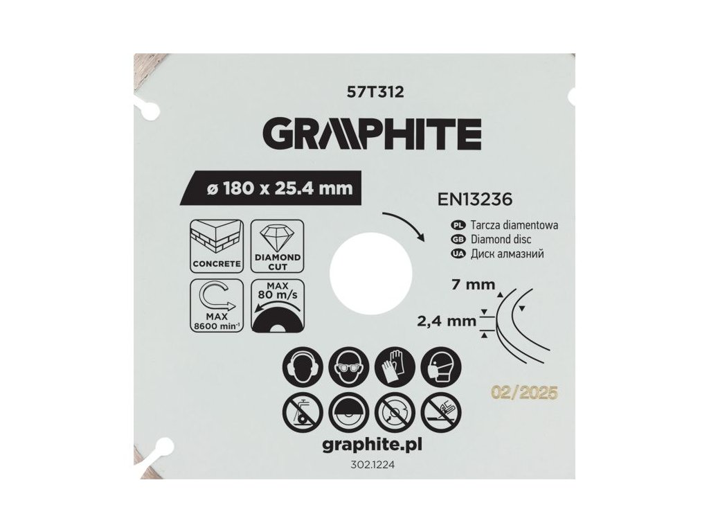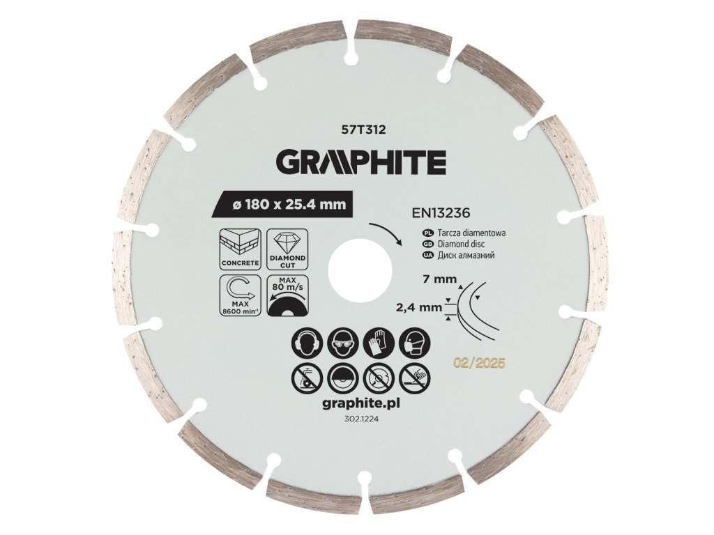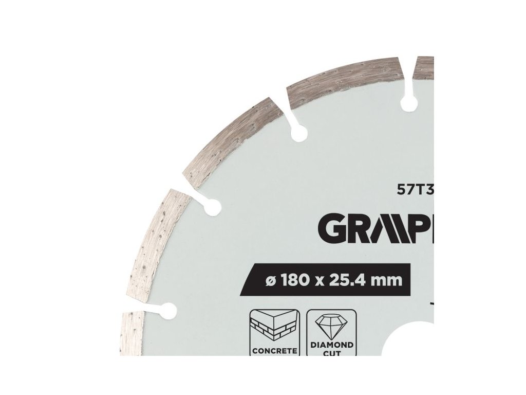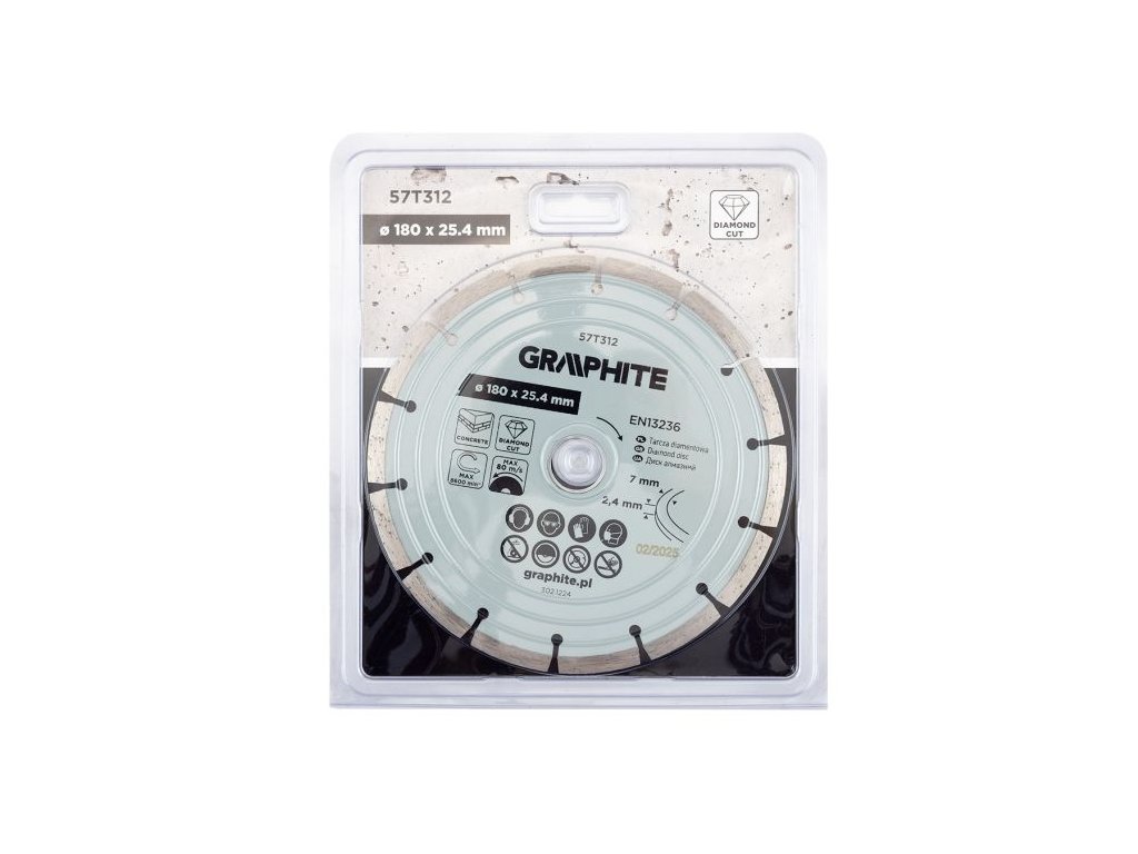 Segmentový diamantový řezný kotouč GRAPHITE 57T312 (Ø 180 × 25,4 mm) je určen pro suché řezání tvrdých a odolných materiálů, jako je žula, beton, cihly, přírodní kámen nebo mramor.
