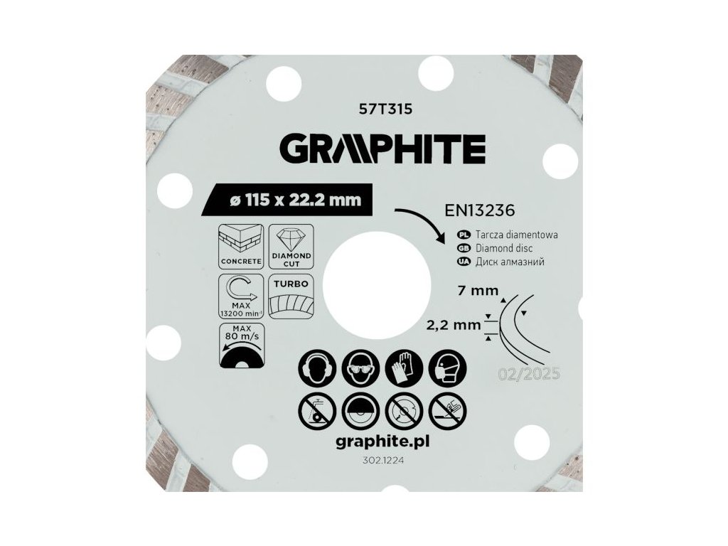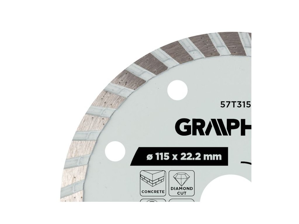 Turbo diamantový řezný kotouč GRAPHITE 57T315 (Ø 115 × 22,2 mm) je určen pro suché řezání tvrdých a křehkých materiálů, jako je přírodní kámen, cihly, mramor, žula či beton.