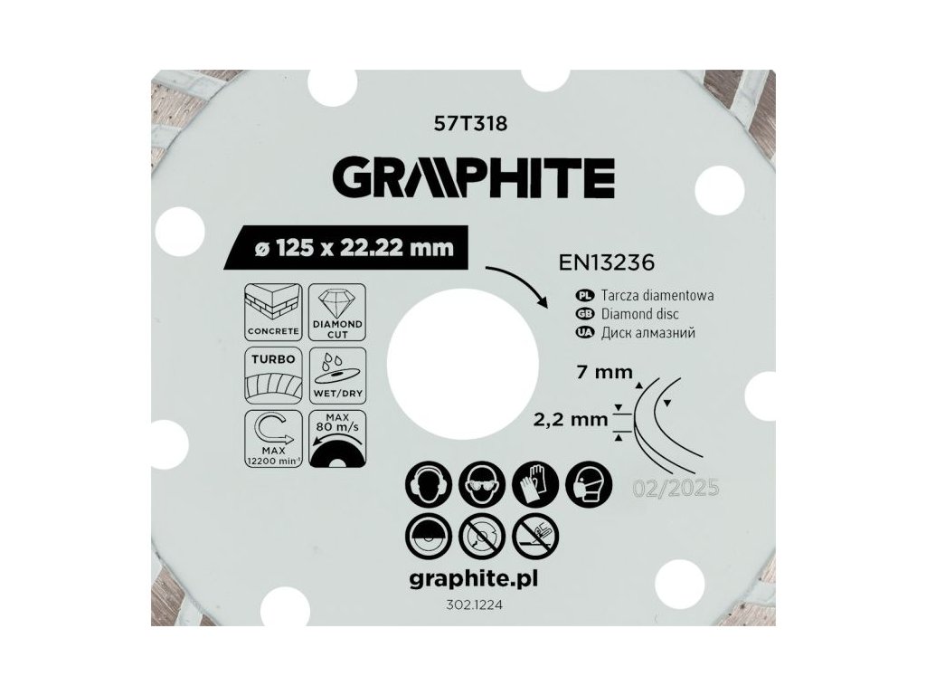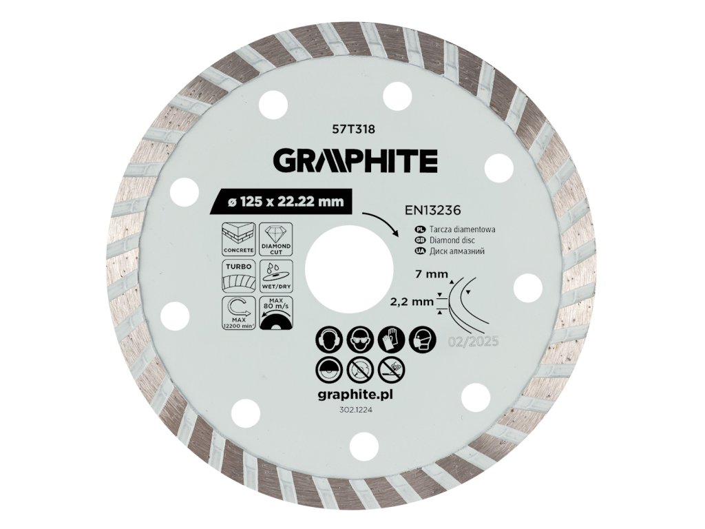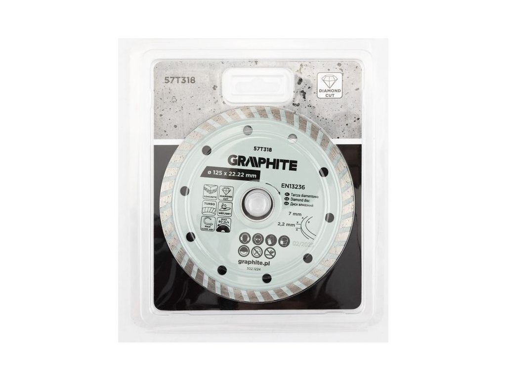 Turbo diamantový řezací kotouč GRAPHITE 57T318 (Ø 125 × 22,2 mm) je univerzální nástroj vhodný pro suché i mokré řezání tvrdých materiálů, jako je kámen, cihly, mramor, žula či beton.