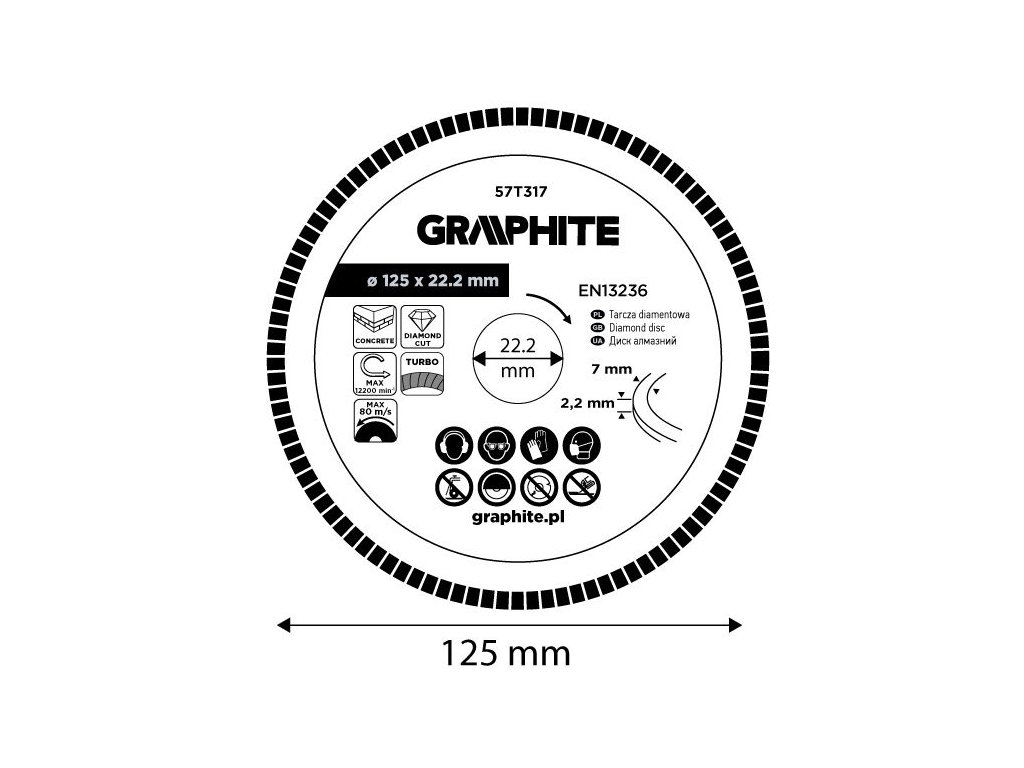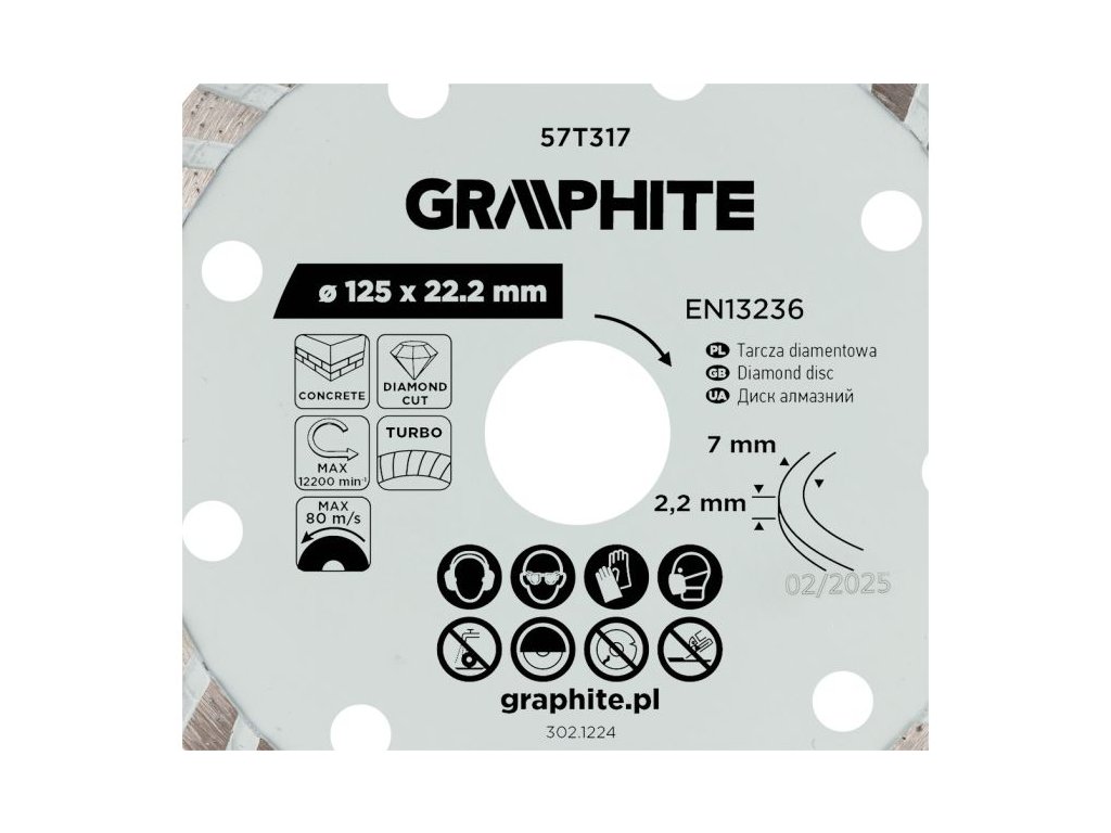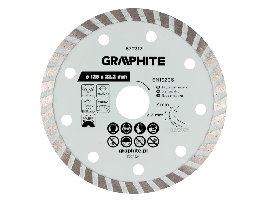 Turbo diamantový řezací kotouč GRAPHITE 57T317 (Ø 125 × 22,2 mm) je určen pro suché řezání tvrdých a odolných materiálů, jako je přírodní kámen, cihly, mramor, žula nebo beton.