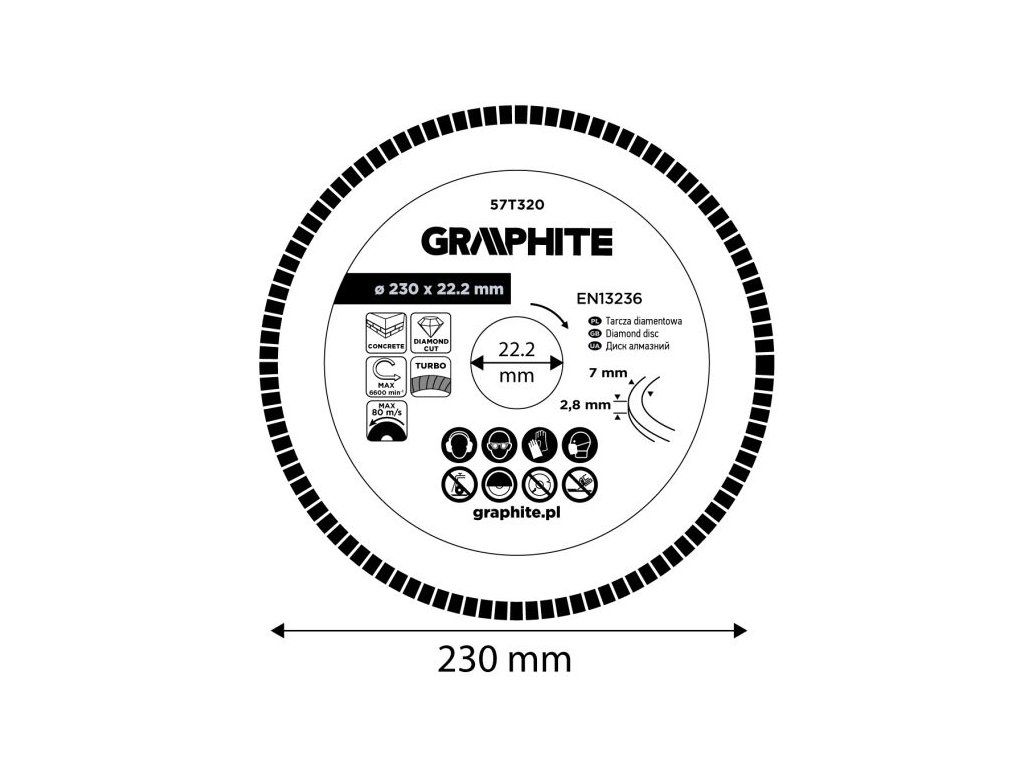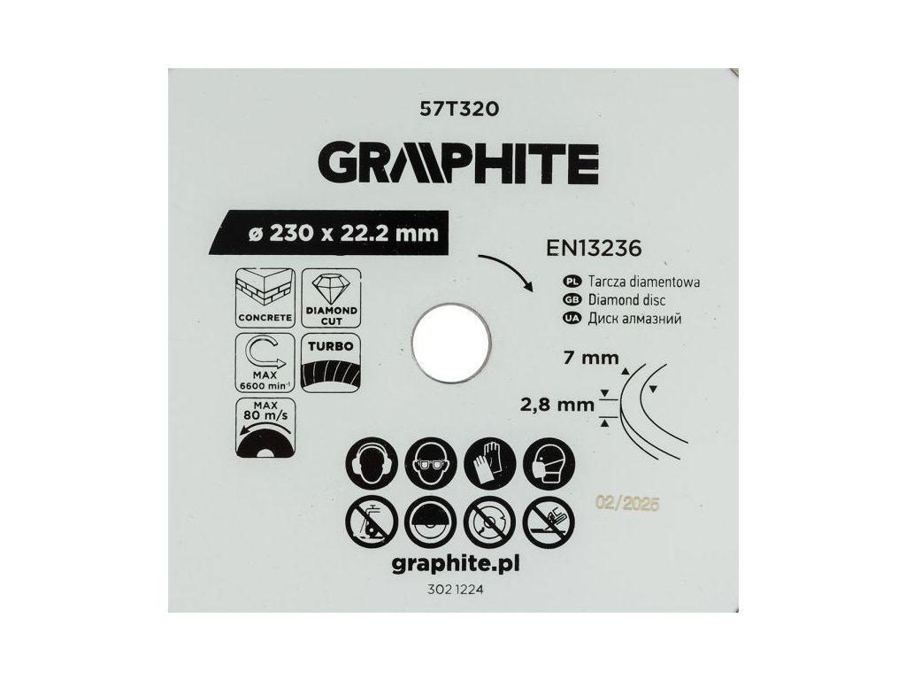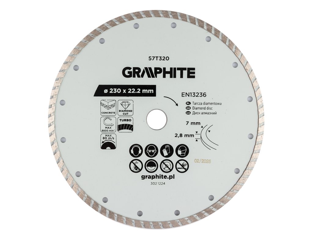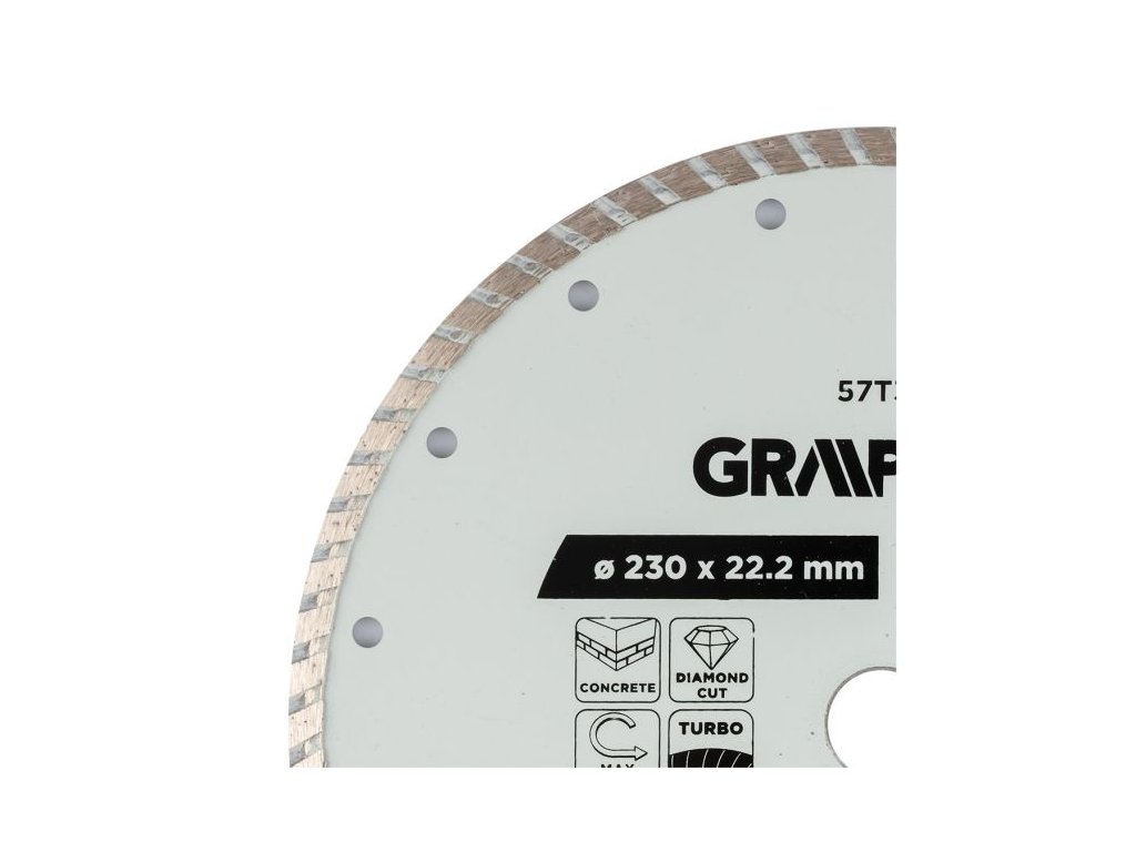 Turbo diamantový řezací kotouč GRAPHITE 57T320 (Ø 230 × 22,2 mm) je robustní nástroj určený pro suché řezání tvrdých stavebních materiálů, jako je přírodní kámen, cihly, mramor, žula či beton.