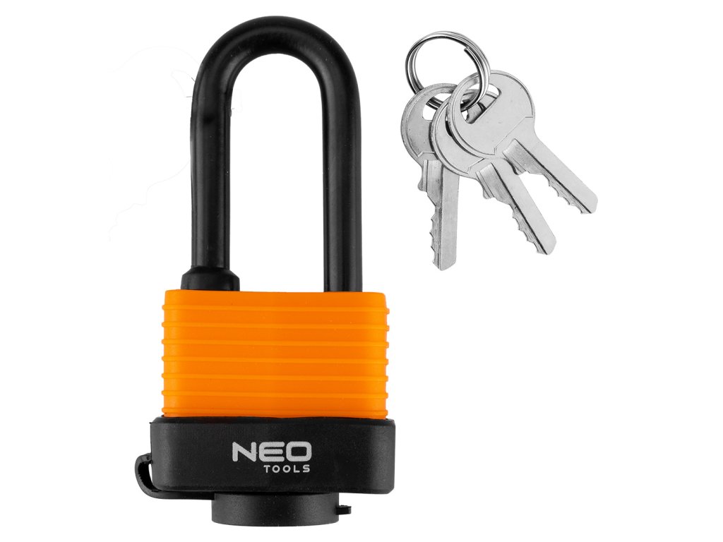 Dlouhý vodotěsný laminovaný visací zámek NEO TOOLS s gumovým krytem 40 mm 85-020 je laminovaný ocelový visací zámek s plastovým krytem a gumovými kroužky na třmenu. Je vybaven třemi klíči. Díky použitým materiálům a vhodné konstrukci se vyznačuje vysokou odolností proti povětrnostním vlivům. Průměr hlavice je 7,5 mm. Jedná se o robustní zabezpečovací zařízení, které lze použít pro různé účely, a to jak v interiéru, tak v exteriéru.Doplňkové parametry