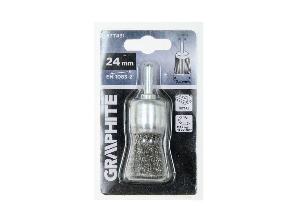 Drátěný kartáč GRAPHITE 24 mm (57T431) je kompaktní nástroj ideální pro detailní práce. Díky stopce 6 mm jej lze snadno upnout do běžné vrtačky nebo aku šroubováku. Vlnitý ocelový drát umožňuje účinné, ale zároveň šetrnější čištění povrchů.