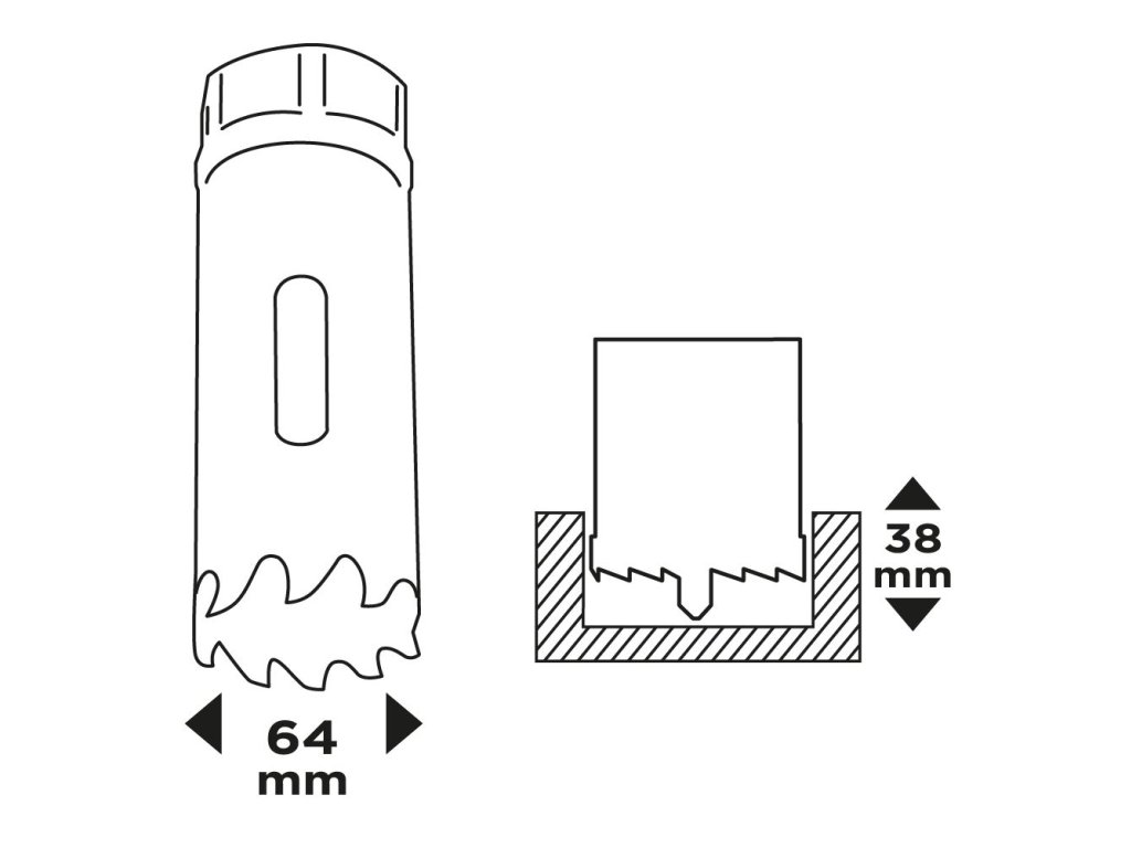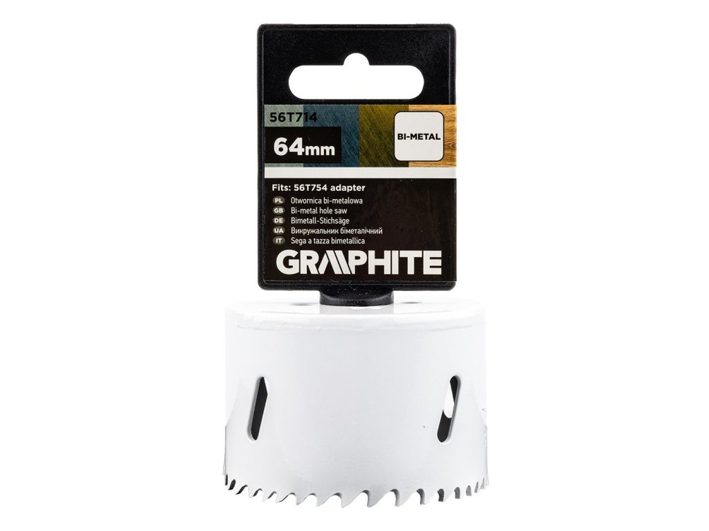 Bimetalová děrovka GRAPHITE 64 mm (56T714) je profesionální nástroj určený k přesnému vrtání otvorů do různých materiálů. Díky konstrukci z rychlořezné oceli HSS nabízí dlouhou životnost a čistý řez bez nadměrného opotřebení.