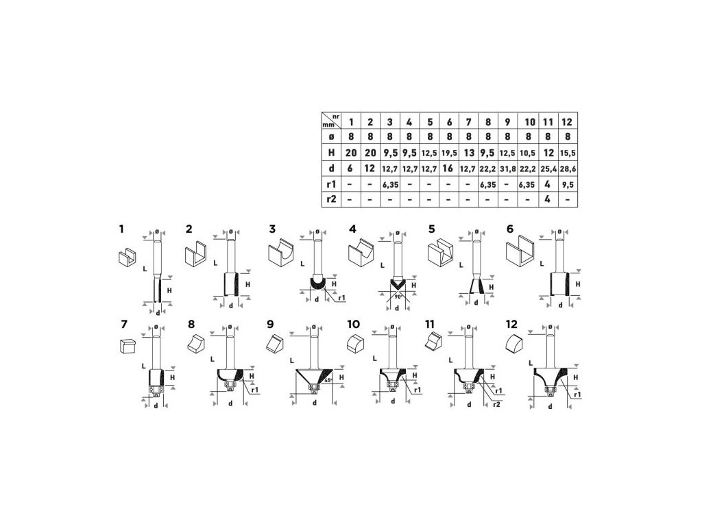 Frézy do dřeva WIDIA, stopka 8 mm, sada 12 ks
