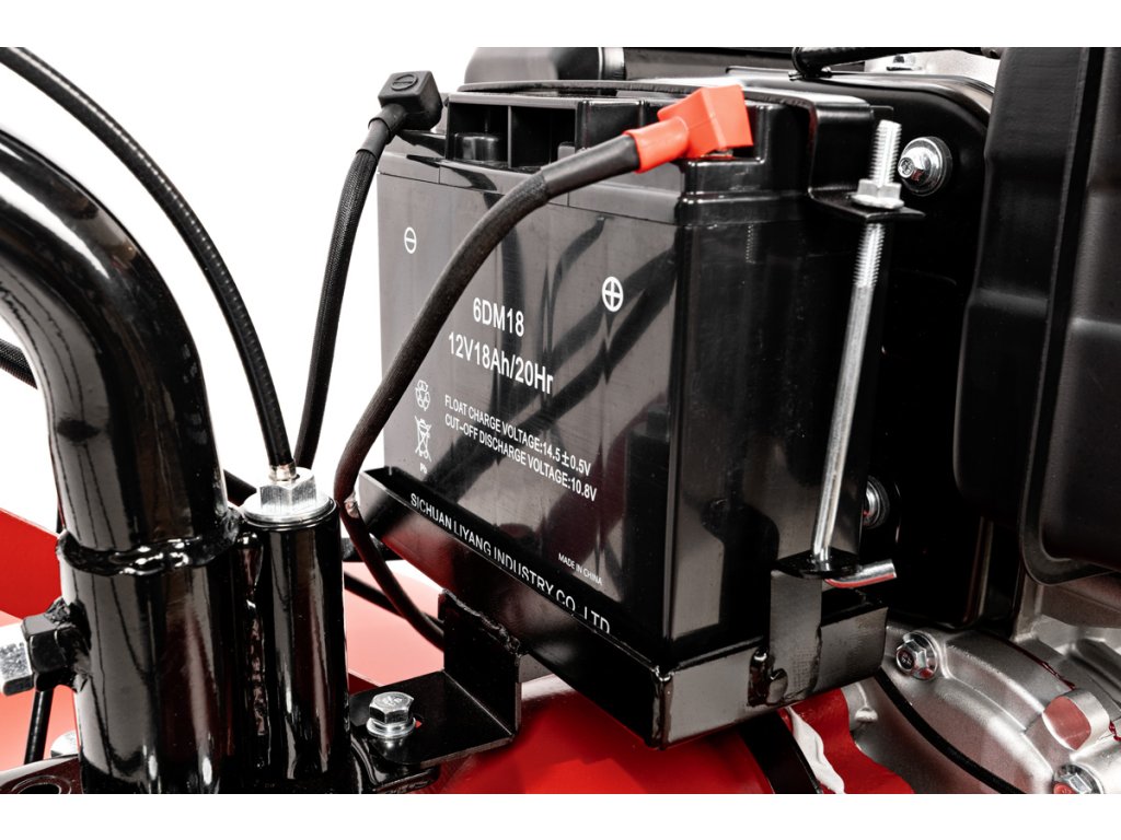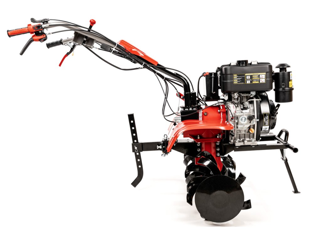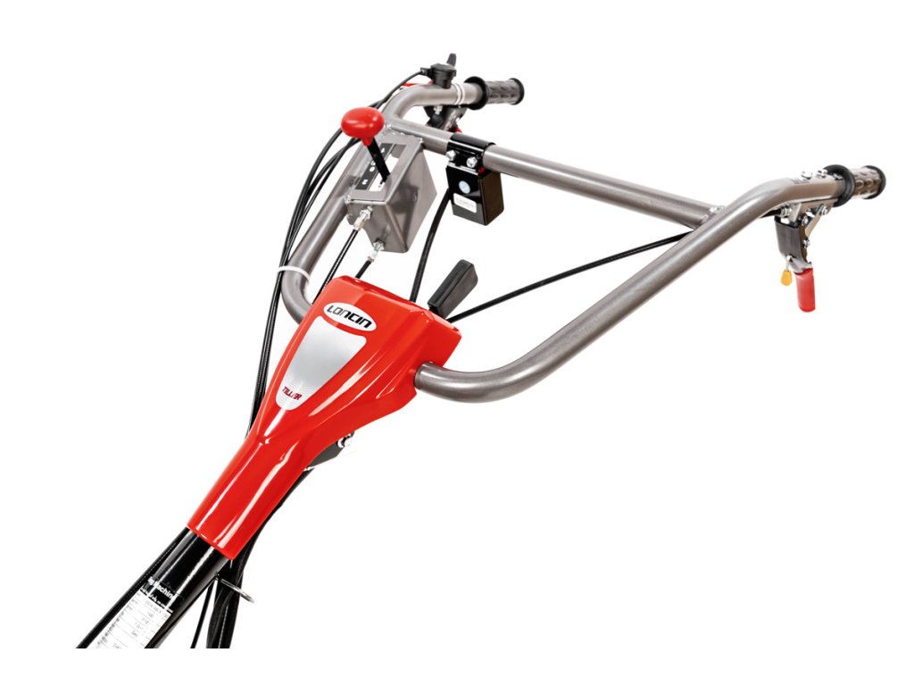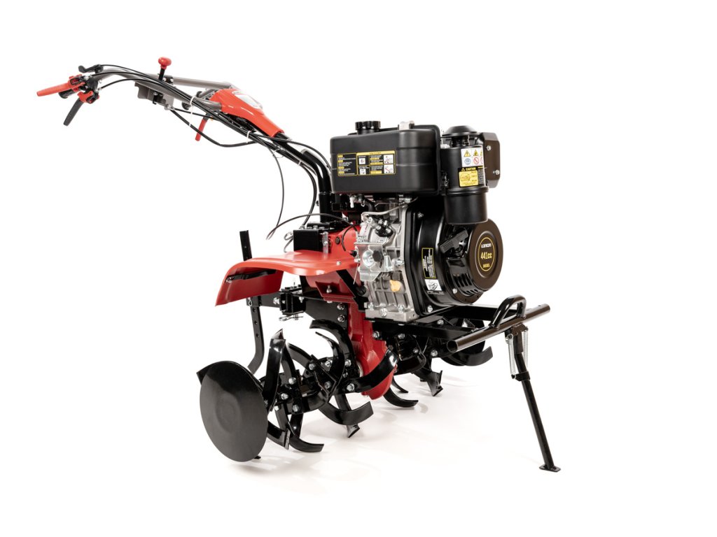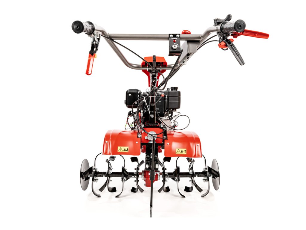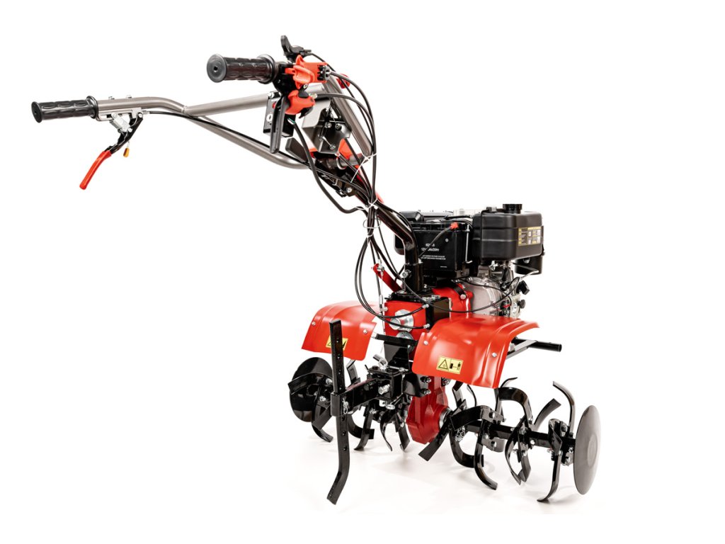 - Kultivátor je vybaven systémem 4+4 nože, odpruženou řídicí rukojetí s nastavením výšky i úhlu, kovovými blatníky, velkými koly a robustní konstrukcí, která zaručuje stabilitu a dlouhou životnost i při práci v tvrdé, kamenité nebo jílovité půdě.
