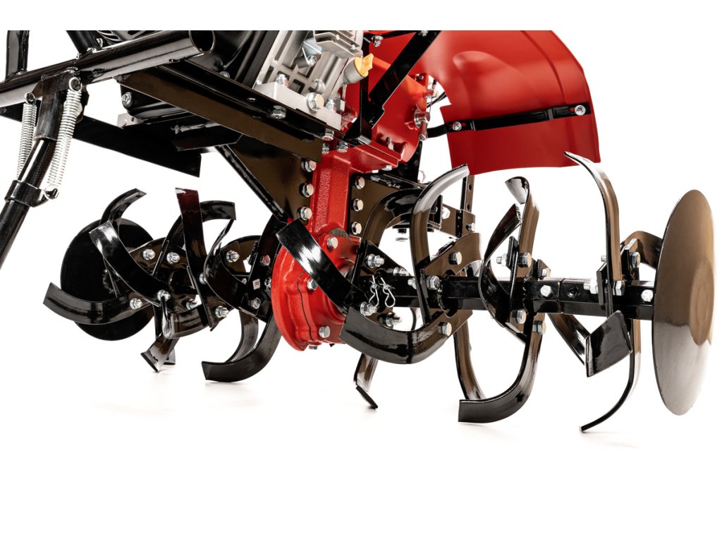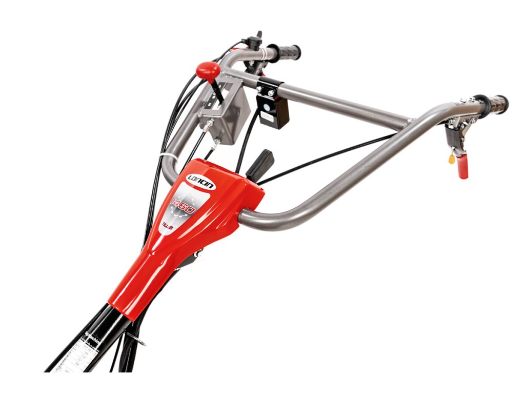- Součástí standardní výbavy jsou také ochranné kryty nožů, kola pro pojezd, výškově a stranově nastavitelná rukojeť, a velká převodovka s kapacitou 2,2 l oleje.