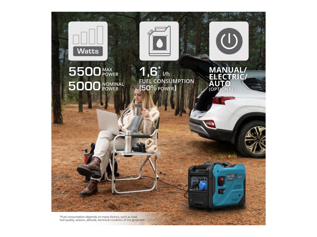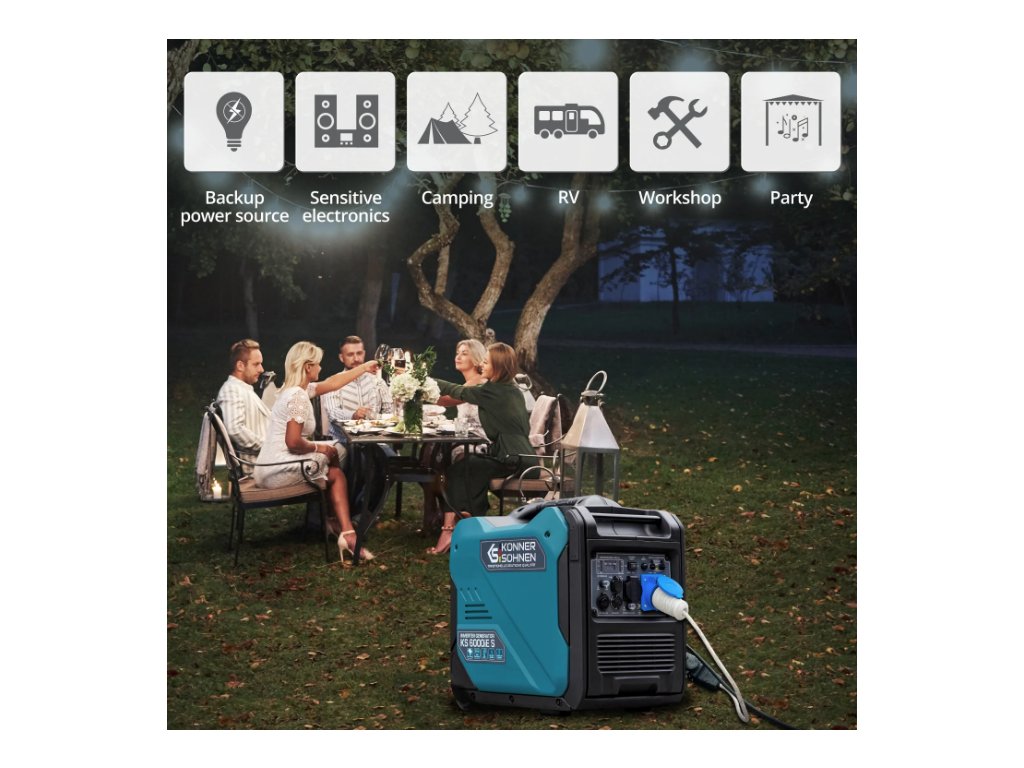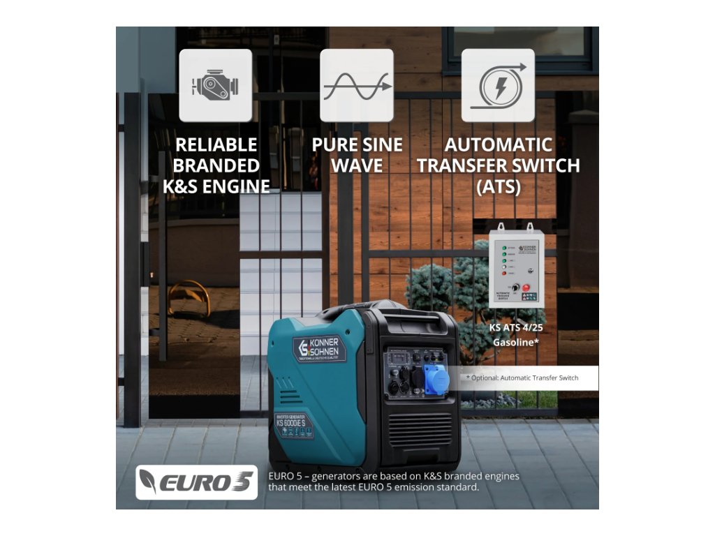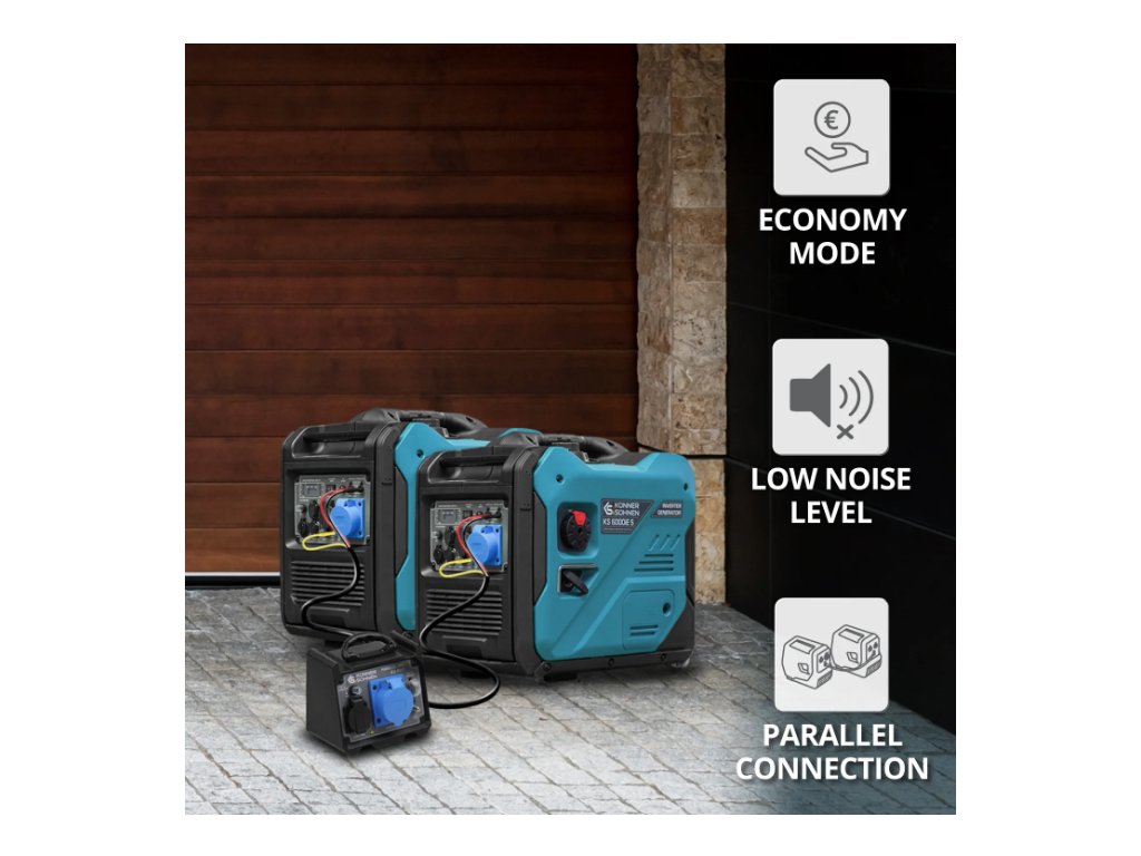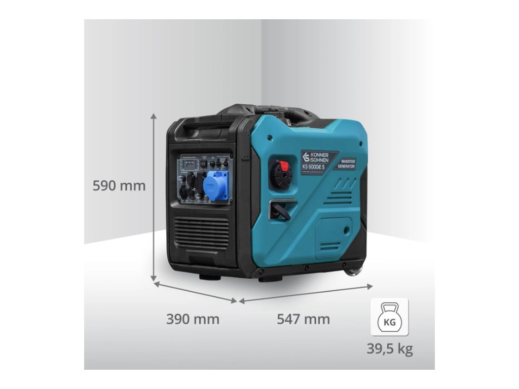 Könner & Söhnen KS 6000iE S je výkonný a přitom kompaktní invertorový generátor s čistou sinusovou vlnou, který je určen pro napájení citlivé elektroniky i běžných domácích spotřebičů. Díky maximálnímu výkonu 5,5 kW a úspornému režimu ECO dokáže efektivně přizpůsobit spotřebu paliva aktuální zátěži.
