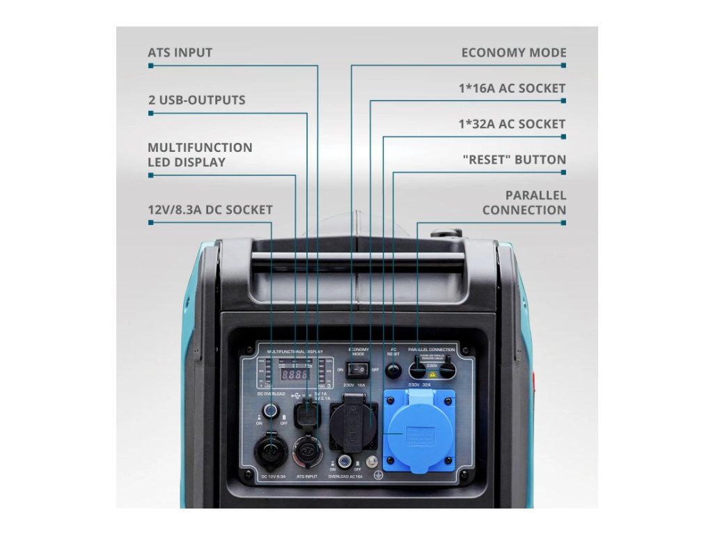 - Je vybaven ergonomickým LED displejem 6v1, který přehledně zobrazuje napětí, frekvenci, zatížení, hladinu paliva i provozní hodiny. Dále nabízí možnost paralelního zapojení, ATS výstup pro automatické spuštění při výpadku elektřiny a USB porty pro nabíjení drobné elektroniky.