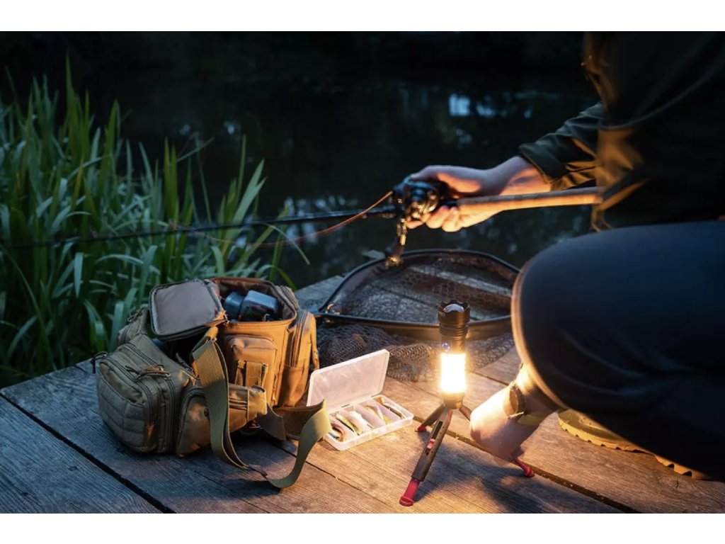 Součástí balení je praktický stojan, díky kterému lze svítilnu snadno proměnit ve stacionární kempingovou lampu a postavit ji na stůl, do stanu nebo na zem. Vestavěná Li-ion baterie 18650 (1200 mAh) poskytuje až 5 hodin provozu a nabíjení přes USB-C (kabel součástí balení) je rychlé a pohodlné i v terénu – například z powerbanky nebo auta.