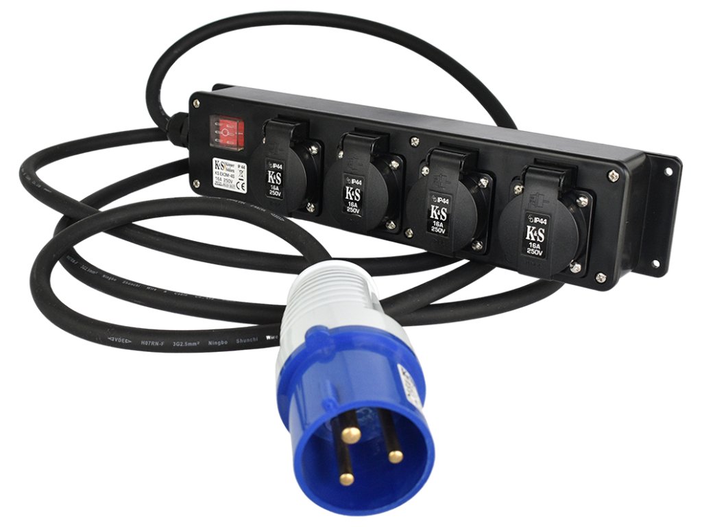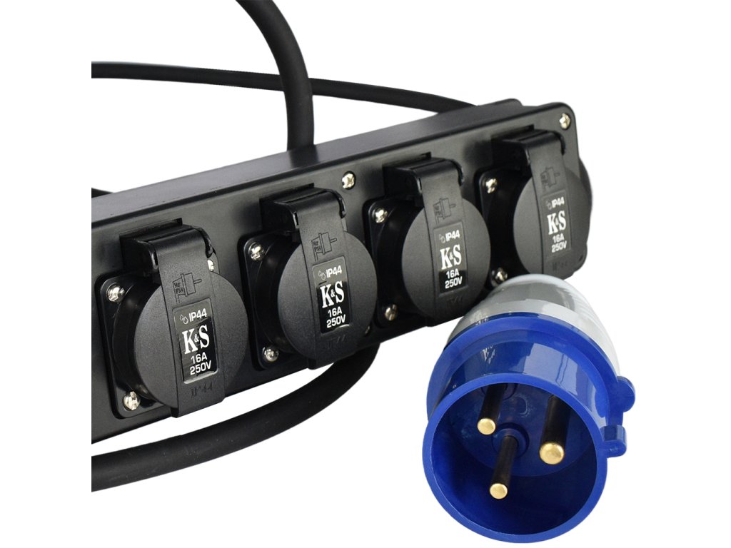 Adaptér KS EX3M-4S se čtyřmi zásuvkami a délkou kabelu 3,0 m se používá v případech, kdy je nutné připojit domácí spotřebiče s normální zástrčku 16A k zásuvce 32A, například v elektrocentrále. Má třídu ochrany IP44, což vám umožňuje používat adaptér venku i při vysoké vlhkosti díky ochraně proti náhodnému vniknutí kapiček vody a pevných částic.