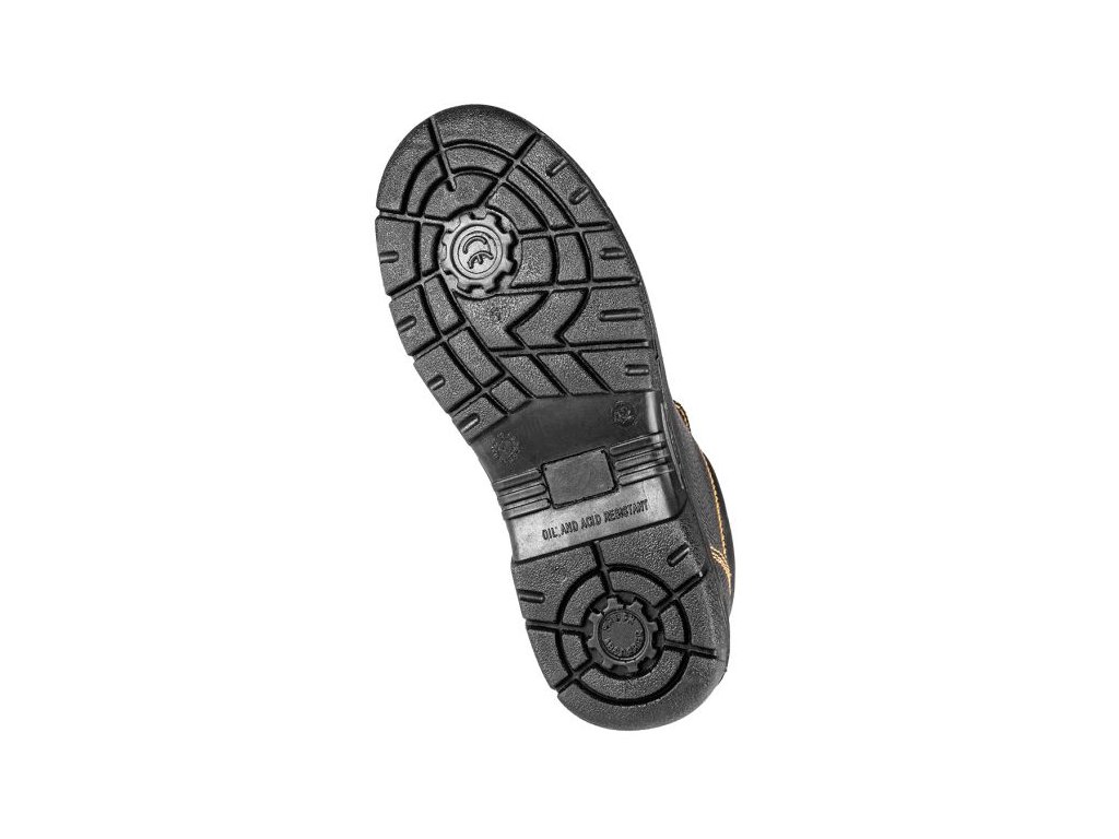 Pracovní obuv má svršek z kvalitní kůže a ražené štípenky. Struktura je navíc vyztužena ocelovou tužinkou, dobře stavěnou patou a dvojitými a trojitými švy. Stélka určená do bot má systém tlumení nárazů, který splňuje normy EN ISO 20345 - podle klasifikace bezpečné obuvi.